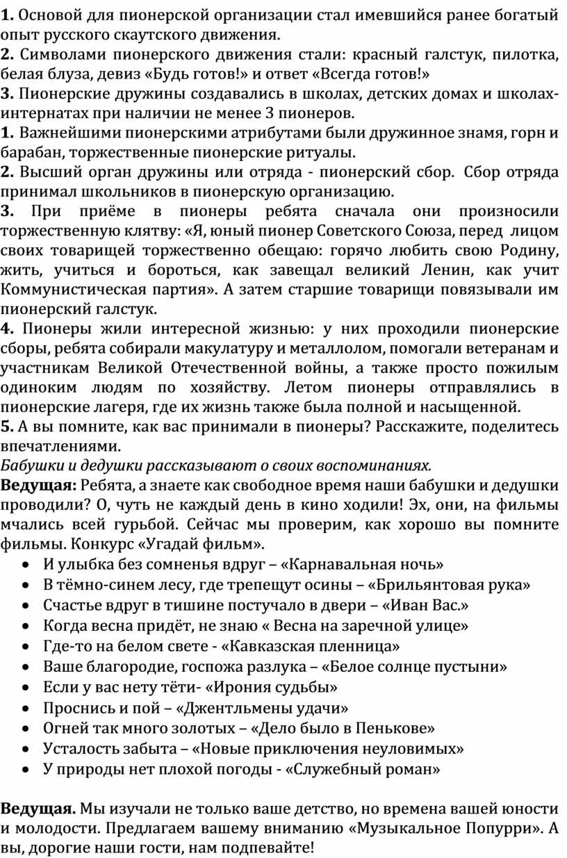 Ведущая. В детстве вы были пионерами. Мы решили узнать поподробнее о пионерской организации.