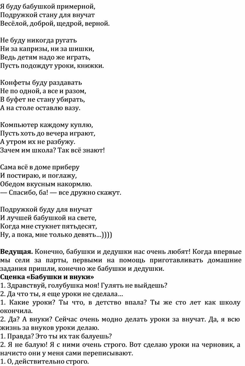 Ведущая. Конечно, бабушки и дедушки нас очень любят! Когда впервые мы сели за парты, первыми на помощь приготавливать домашние задания пришли, конечно же бабушки и дедушки.