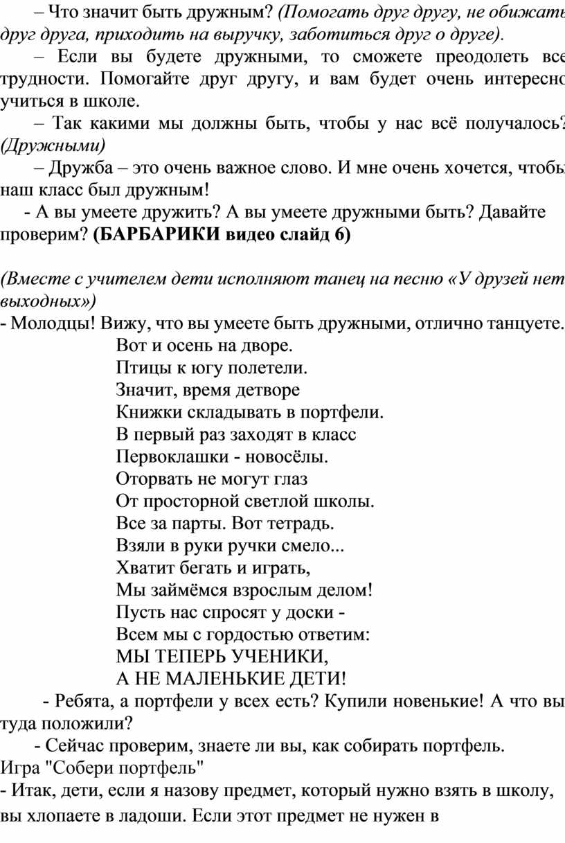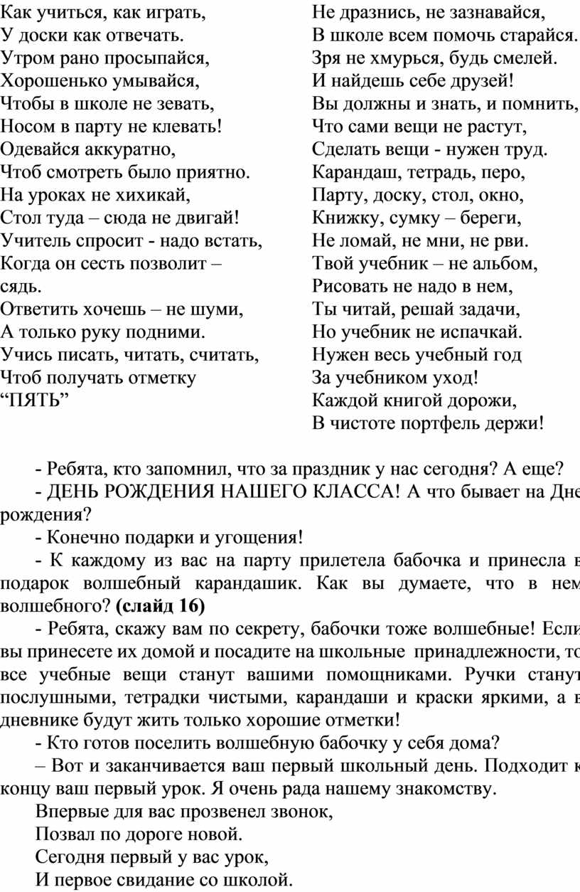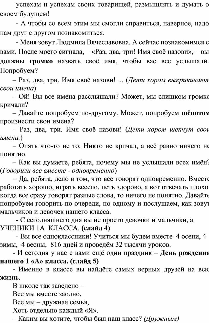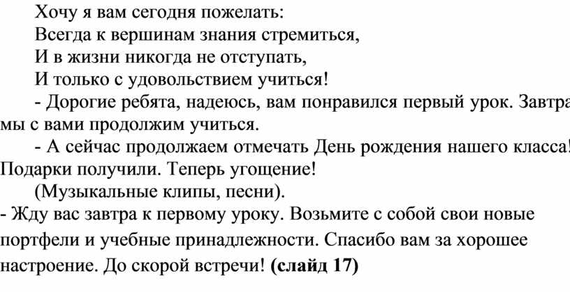 – Вот и заканчивается ваш первый школьный день. Подходит к концу ваш первый урок. Я очень рада нашему знакомству.