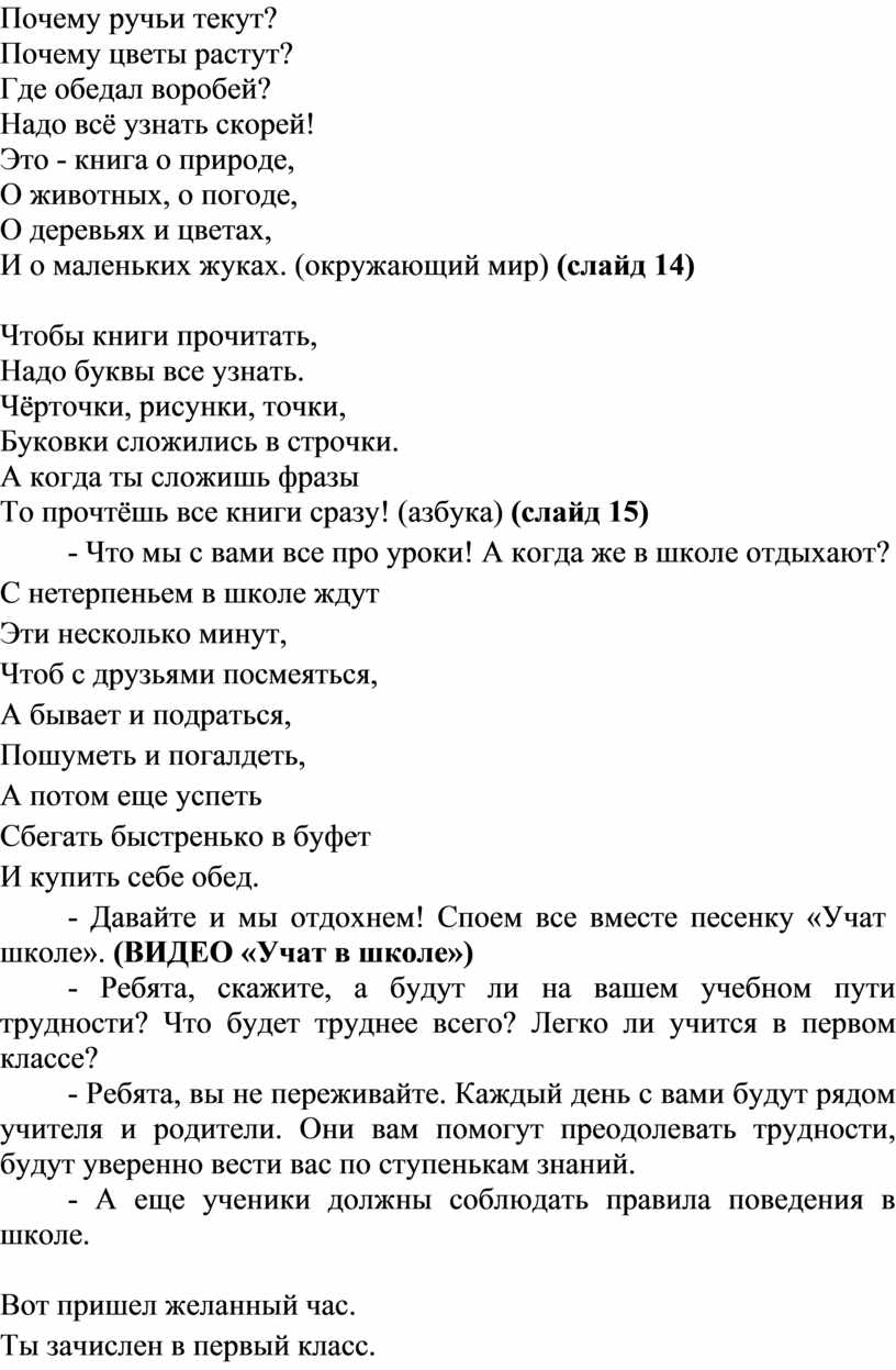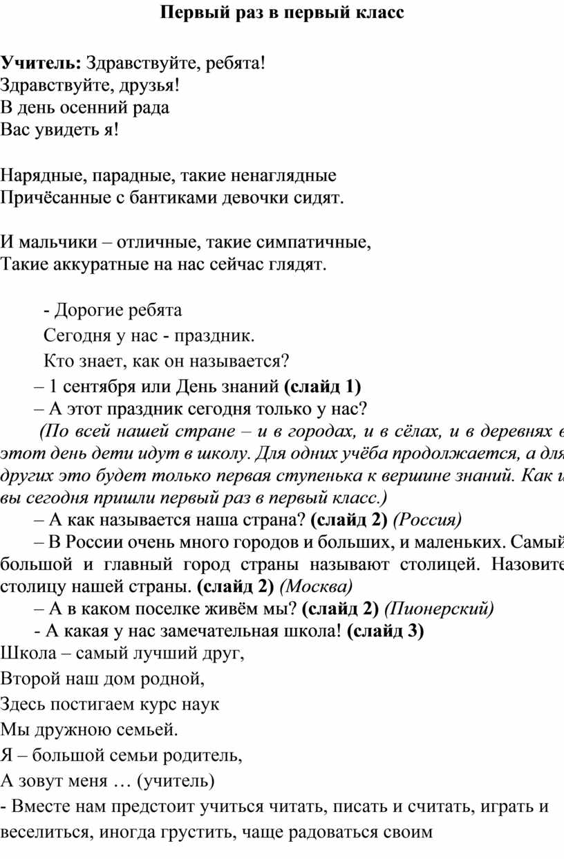 (По всей нашей стране – и в городах, и в сёлах, и в деревнях в этот день дети идут в школу. Для одних учёба продолжается, а для других это будет только первая ступенька к вершине знаний. Как и вы сегодня пришли первый раз в первый класс.)