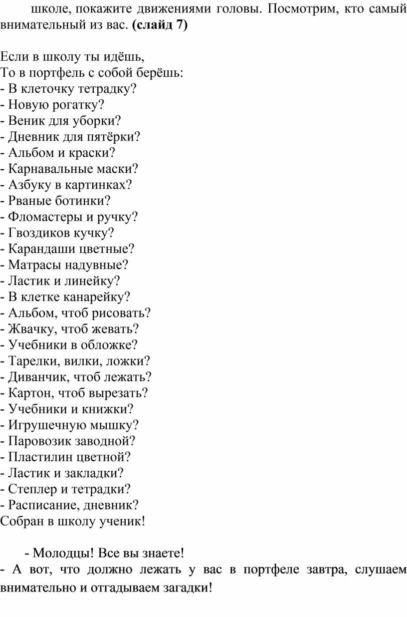- Итак, дети, если я назову предмет, который нужно взять в школу, вы хлопаете в ладоши. Если этот предмет не нужен в школе, покажите движениями головы. Посмотрим, кто самый внимательный из вас. (слайд 7)