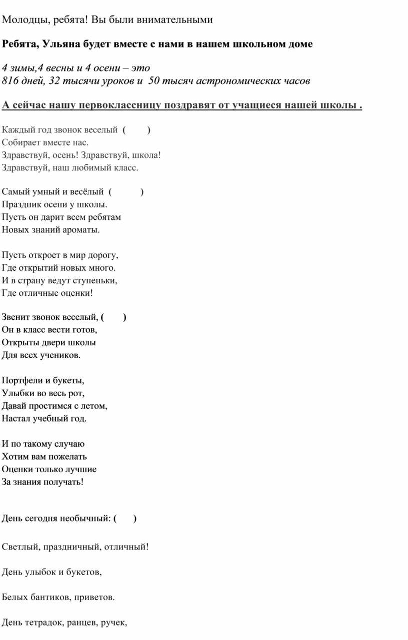 Ребята, сегодня на нашей торжественной линейке присутствуют ваши младшие товарищи – воспитанники детского сада «Колосок». Они пришли поздравить Ульяну, произнести ей напутственные слова и поздравления. Давайте дадим им слово.