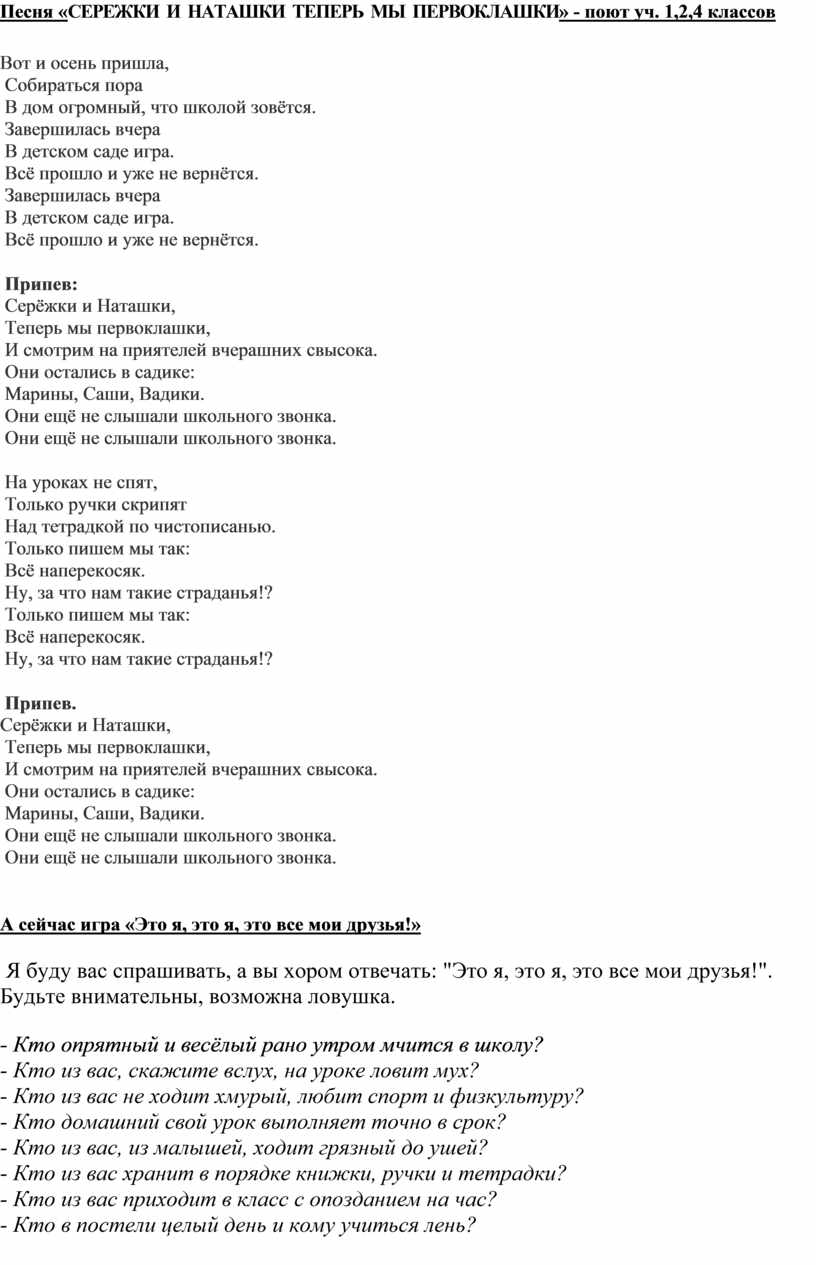 Песня «СЕРЕЖКИ И НАТАШКИ ТЕПЕРЬ МЫ ПЕРВОКЛАШКИ» - поют уч. 1,2,4 классов
