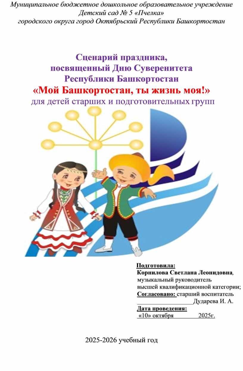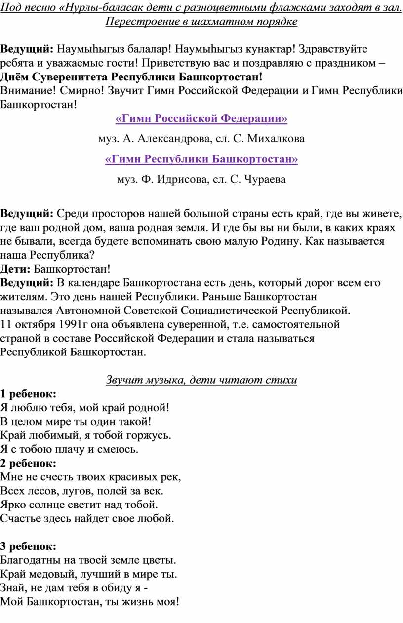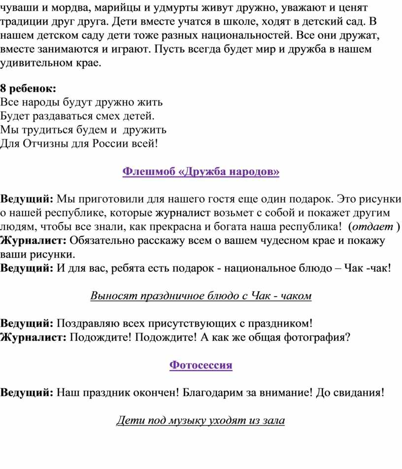 Ведущий: Республика Башкортостан - многонациональна, в ней проживают представители 160 национальностей. Башкиры и русские, татары и армяне, чуваши и мордва, марийцы и удмурты живут дружно, уважают и ценят традиции друг друга. Дети вместе учатся в школе, ходят в детский сад. В нашем детском саду дети тоже разных национальностей. Все они дружат, вместе занимаются и играют. Пусть всегда будет мир и дружба в нашем удивительном крае.