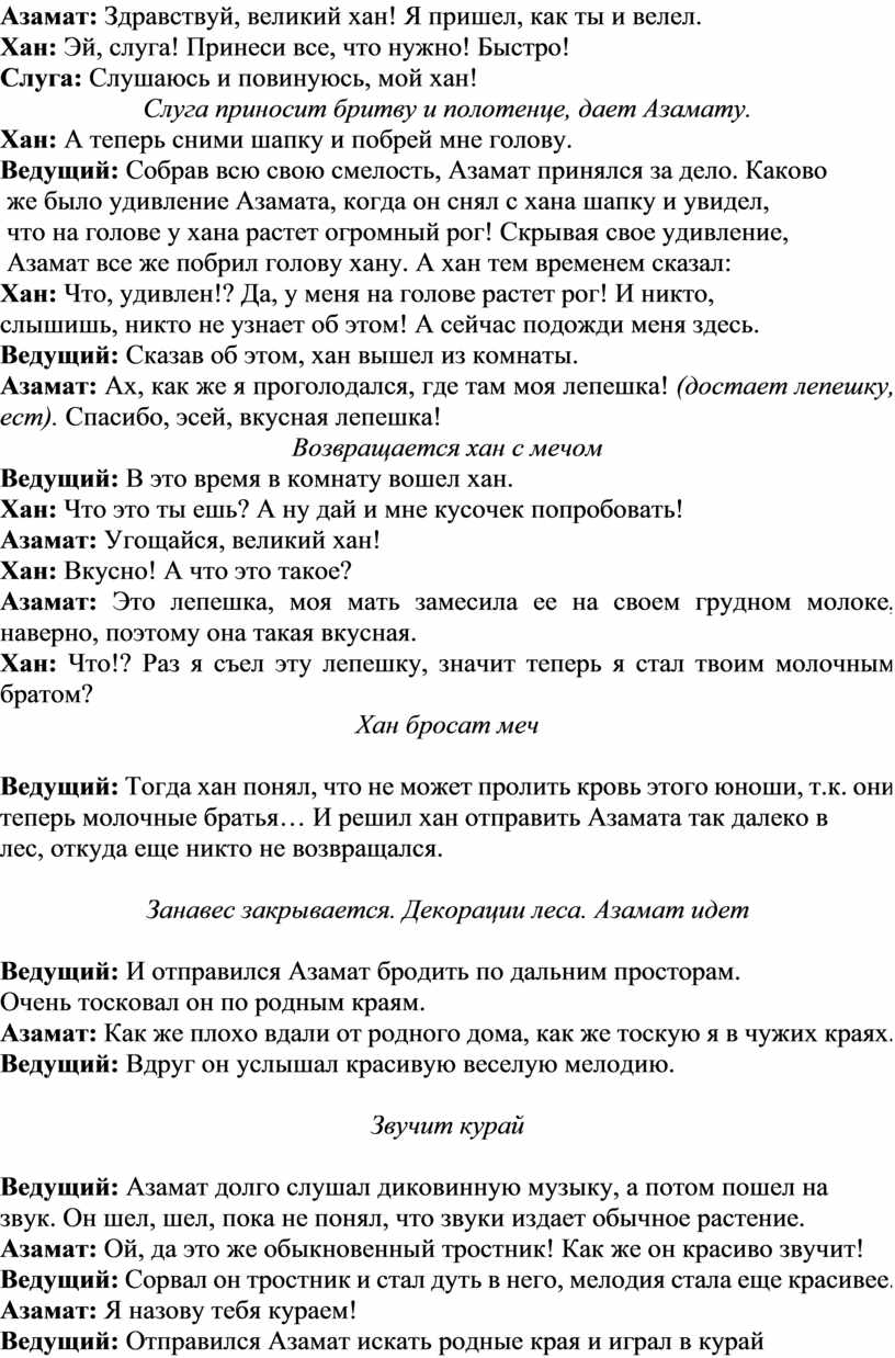 Ведущий: Тогда хан понял, что не может пролить кровь этого юноши, т.к. они теперь молочные братья… И решил хан отправить Азамата так далеко в