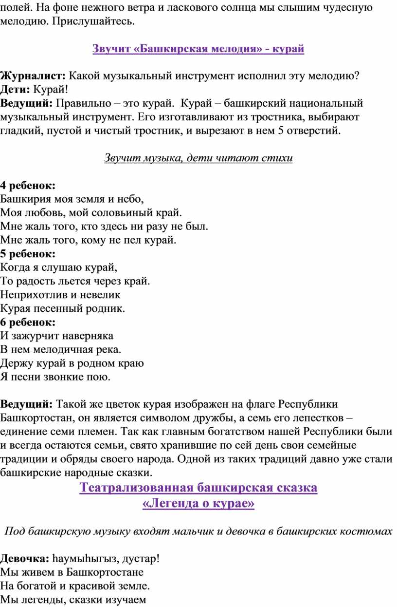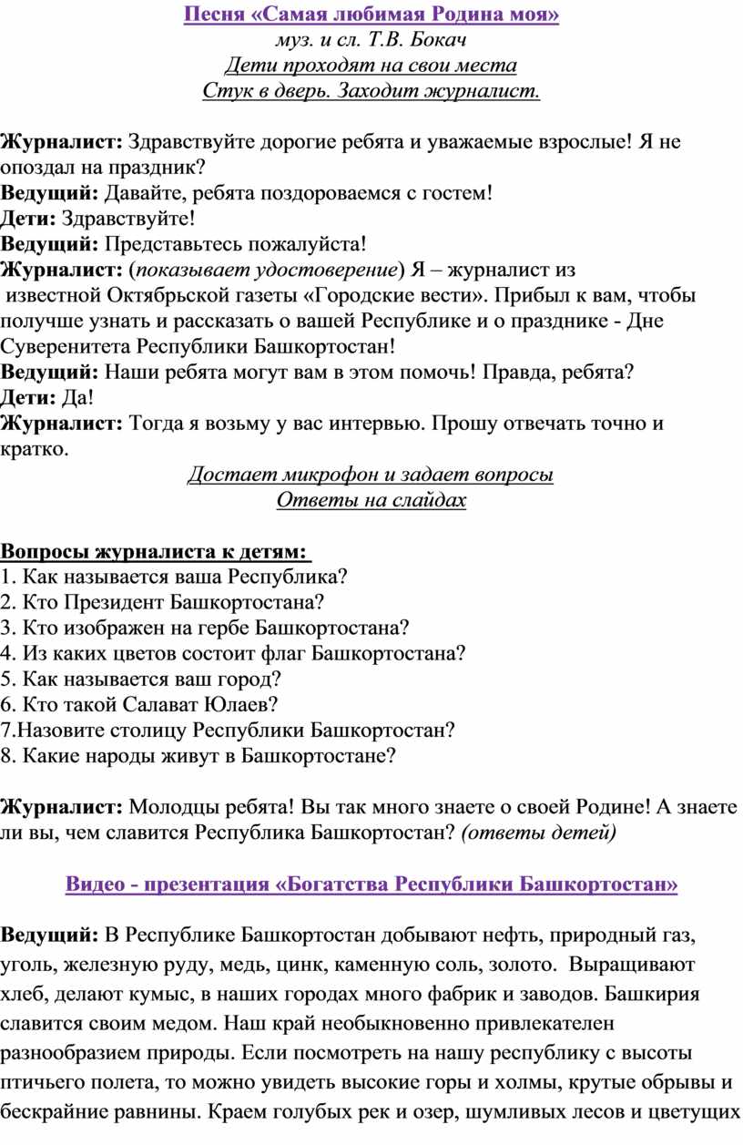 Журналист: Молодцы ребята! Вы так много знаете о своей Родине! А знаете ли вы, чем славится Республика Башкортостан? (ответы детей)