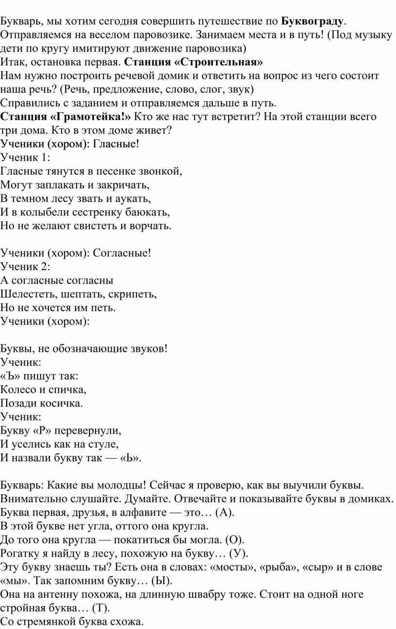 Букварь, мы хотим сегодня совершить путешествие по Буквограду. Отправляемся на веселом паровозике. Занимаем места и в путь! (Под музыку дети по кругу имитируют движение паровозика)
