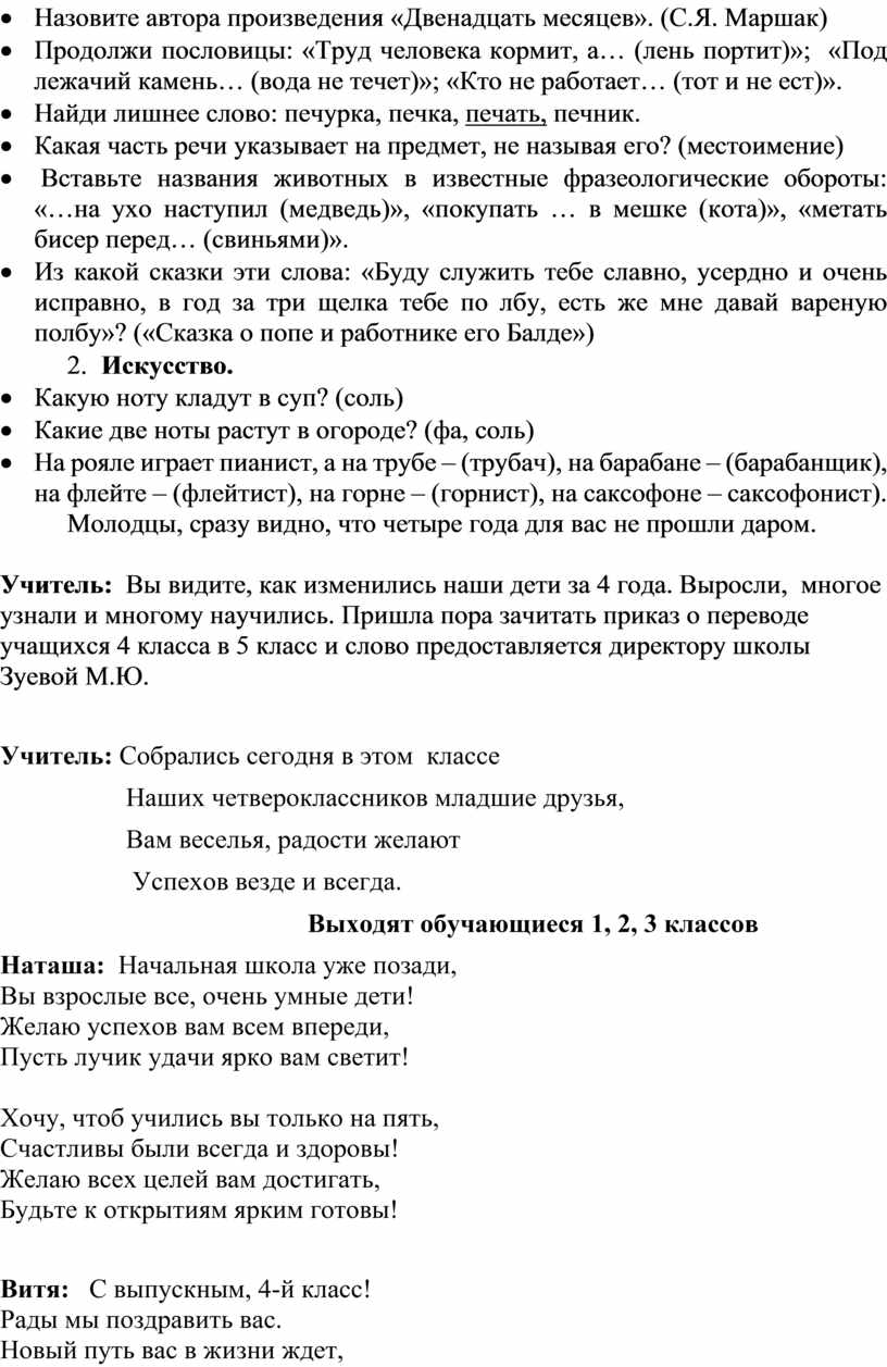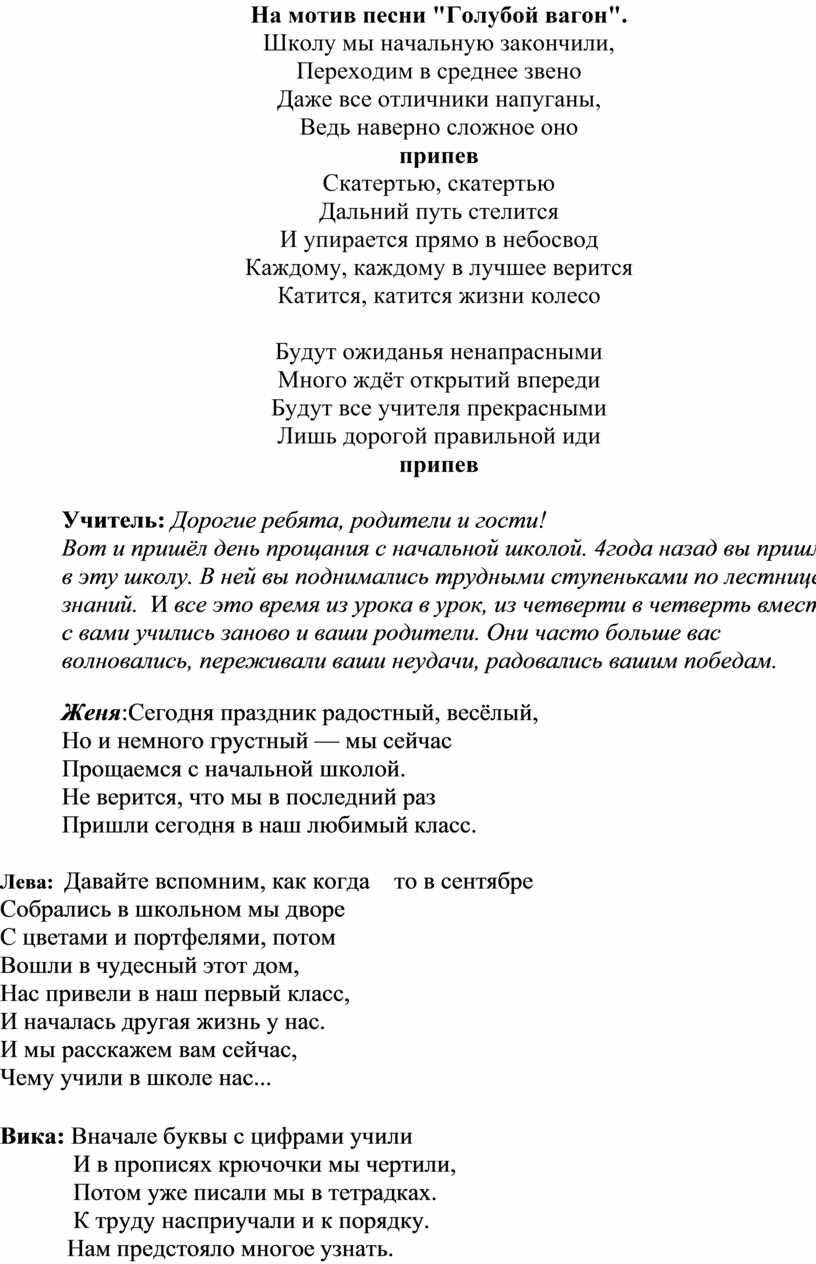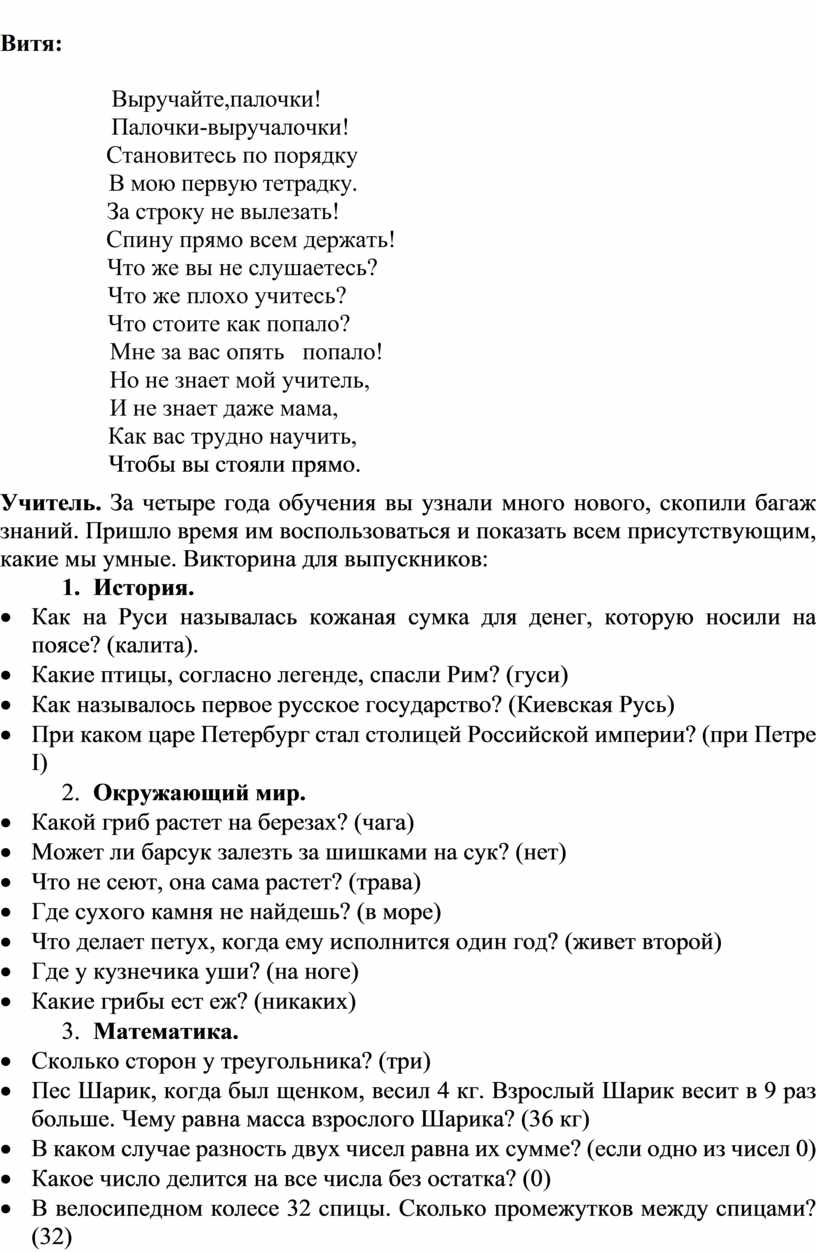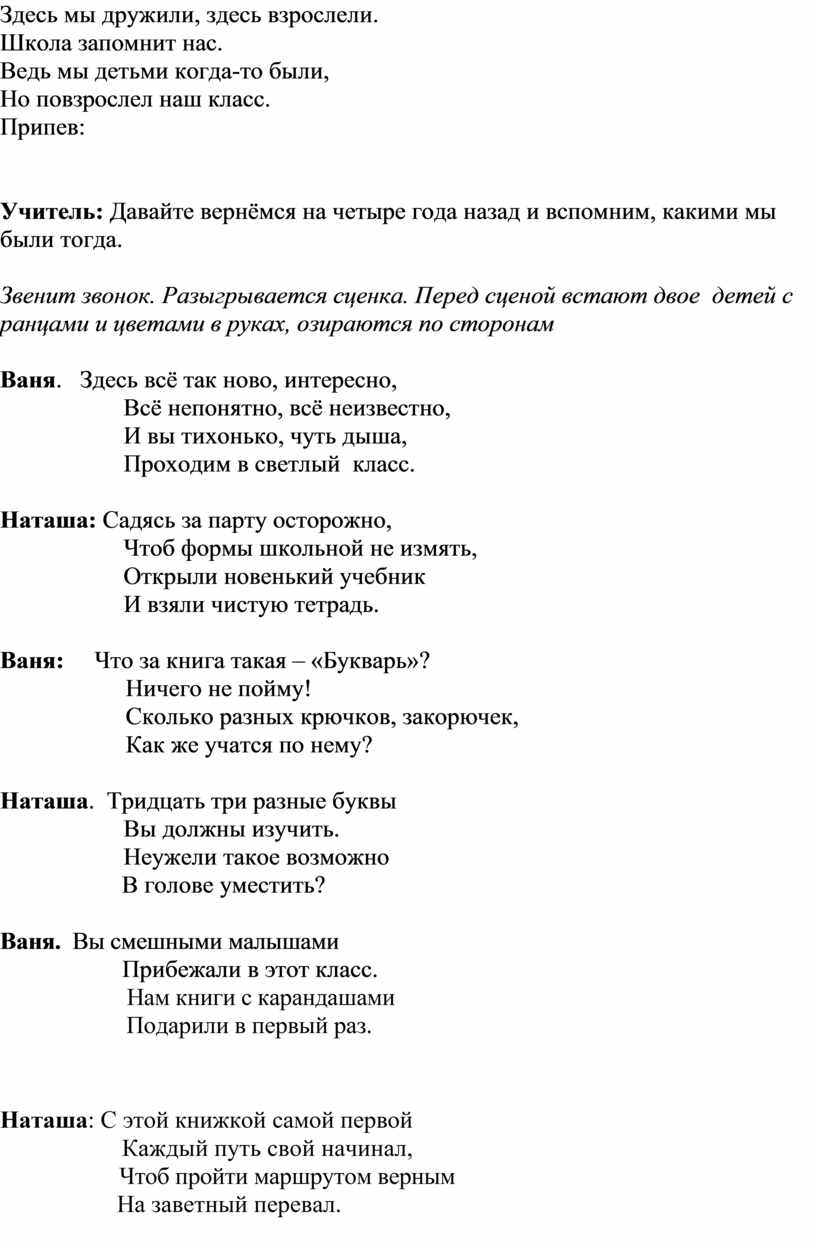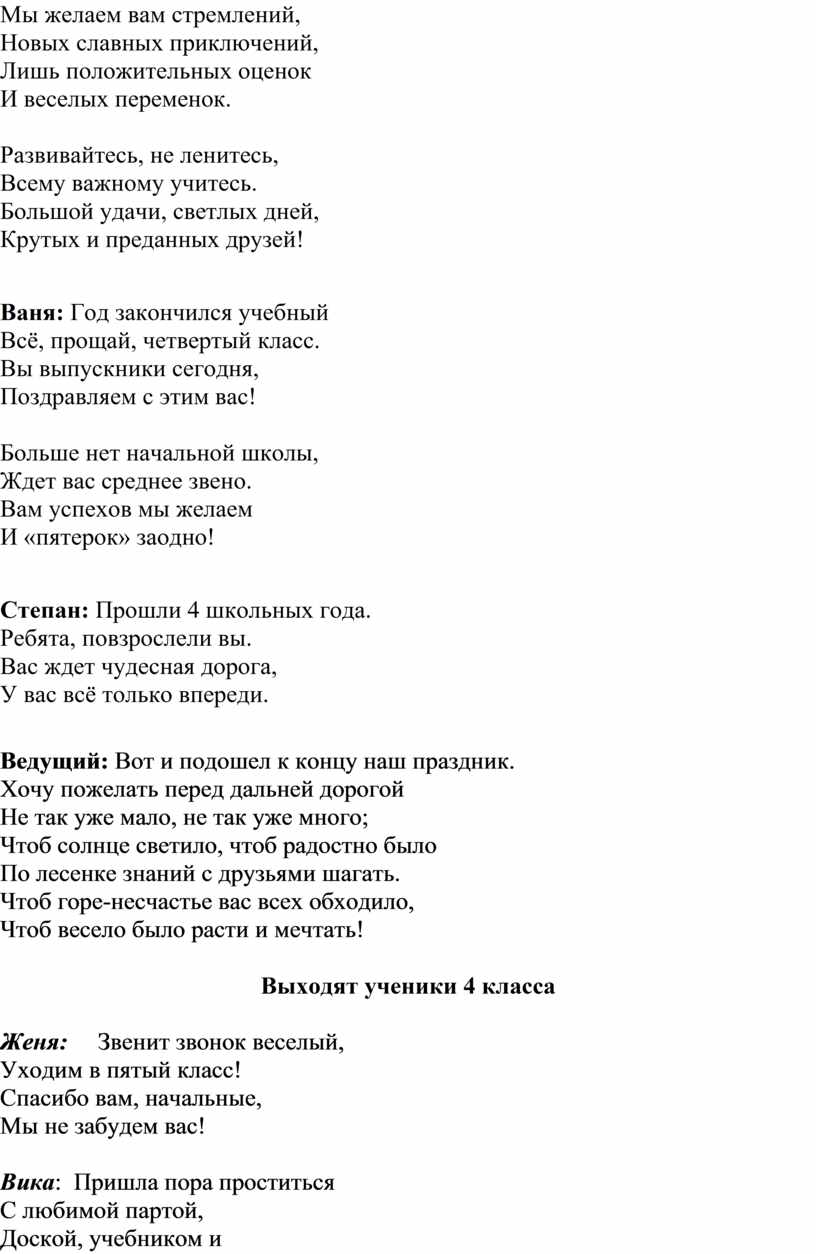 Вот и пришёл день прощания с начальной школой. 4года назад вы пришли в эту школу. В ней вы поднимались трудными ступеньками по лестнице знаний. И все это время из урока в урок, из четверти в четверть вместе с вами учились заново и ваши родители. Они часто больше вас волновались, переживали ваши неудачи, радовались вашим победам.