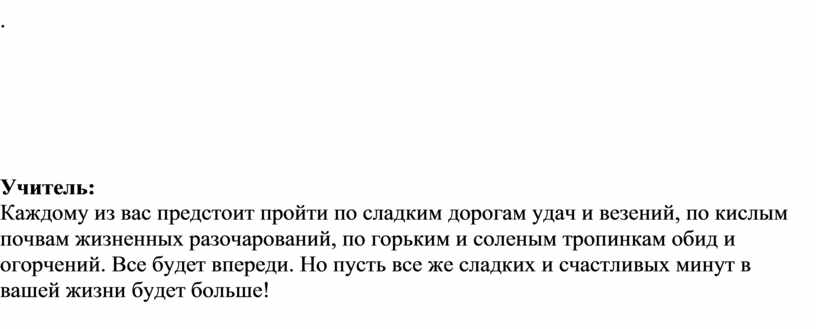 Каждому из вас предстоит пройти по сладким дорогам удач и везений, по кислым почвам жизненных разочарований, по горьким и соленым тропинкам обид и огорчений. Все будет впереди. Но пусть все же сладких и счастливых минут в вашей жизни будет больше!