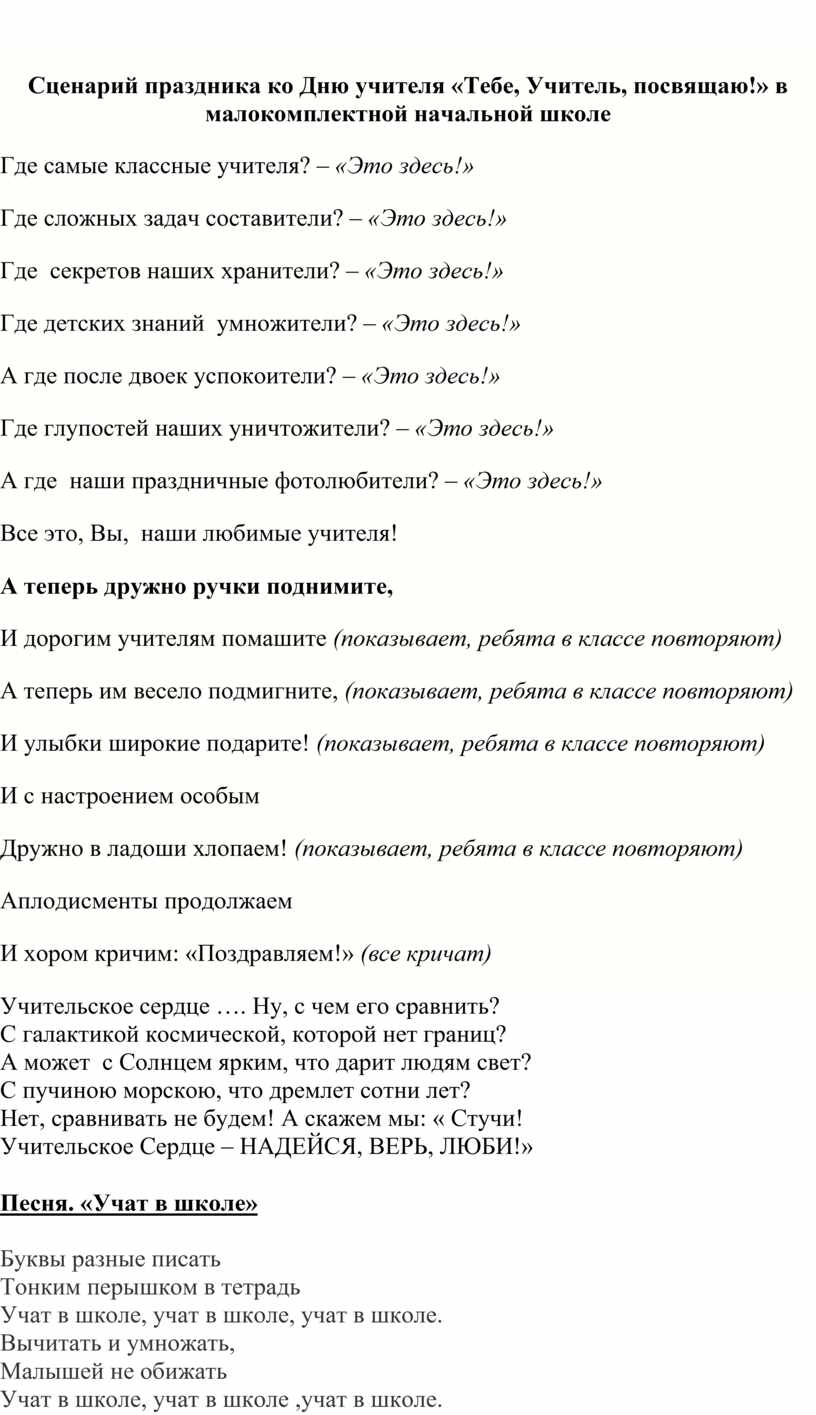Сценарий праздника ко Дню учителя «Тебе, Учитель, посвящаю!» в малокомплектной начальной школе