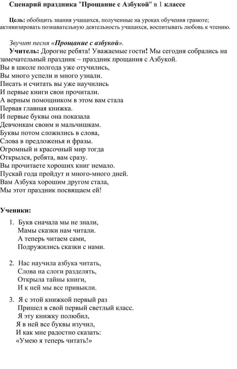 Cценарий праздника "Прощание с Азбукой" в 1 классе
