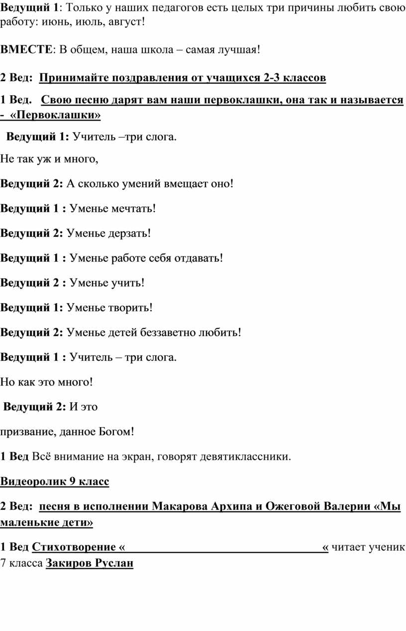 Ведущий 1: Только у наших педагогов есть целых три причины любить свою работу: июнь, июль, август!