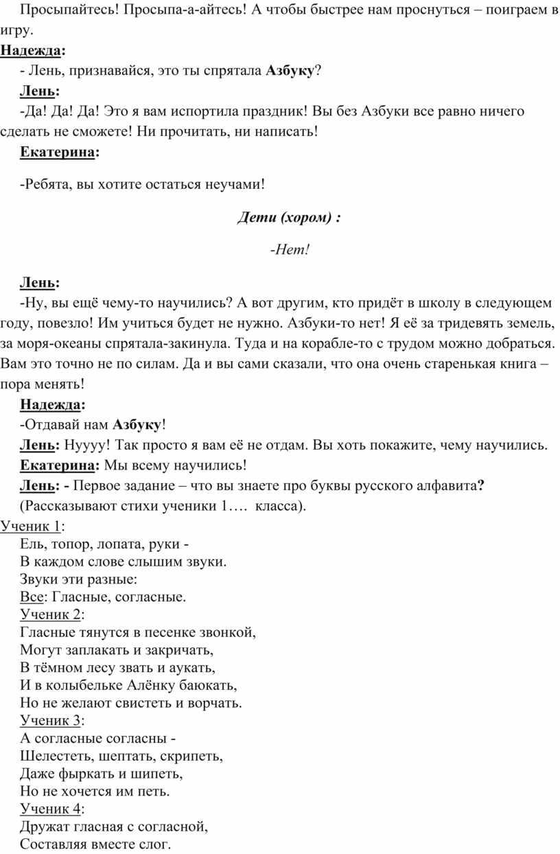 Надежда: Мы хотим тебе, Азбука, сказать: “Спасибо что умеем мы читать и буквы все писать.