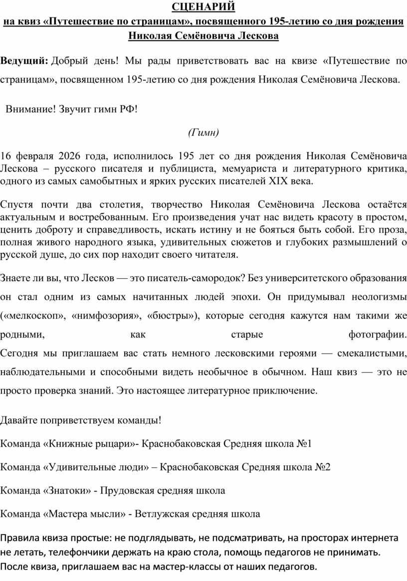 Ведущий: Добрый день! Мы рады приветствовать вас на квизе «Путешествие по страницам», посвященном 195-летию со дня рождения Николая Семёновича Лескова.