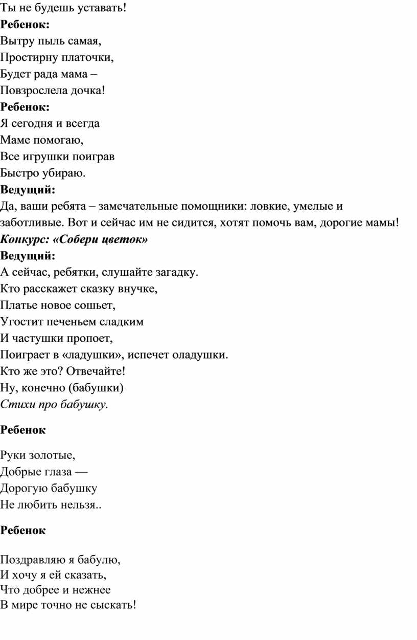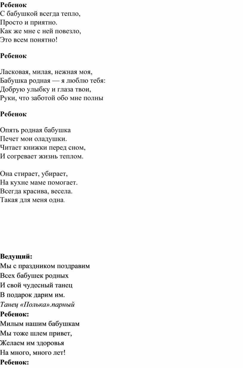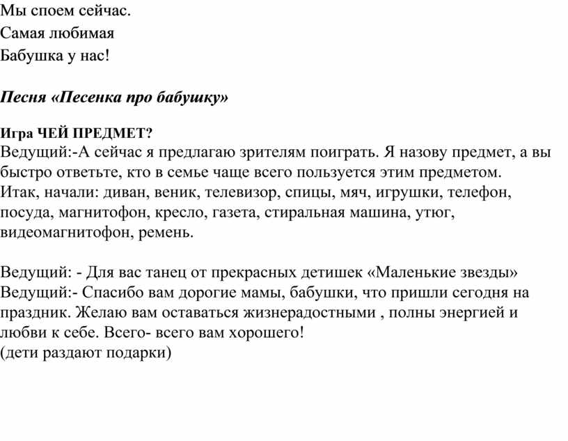 Ведущий:- Спасибо вам дорогие мамы, бабушки, что пришли сегодня на праздник. Желаю вам оставаться жизнерадостными , полны энергией и любви к себе. Всего- всего вам хорошего!
