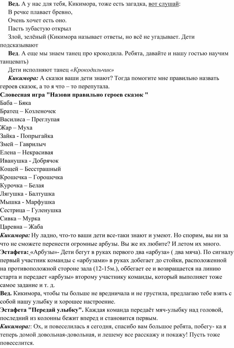 Вед. Кикимора, чтобы ты больше не вредничала и не грустила, предлагаю тебе взять с собой нашу улыбку и хорошее настроение.