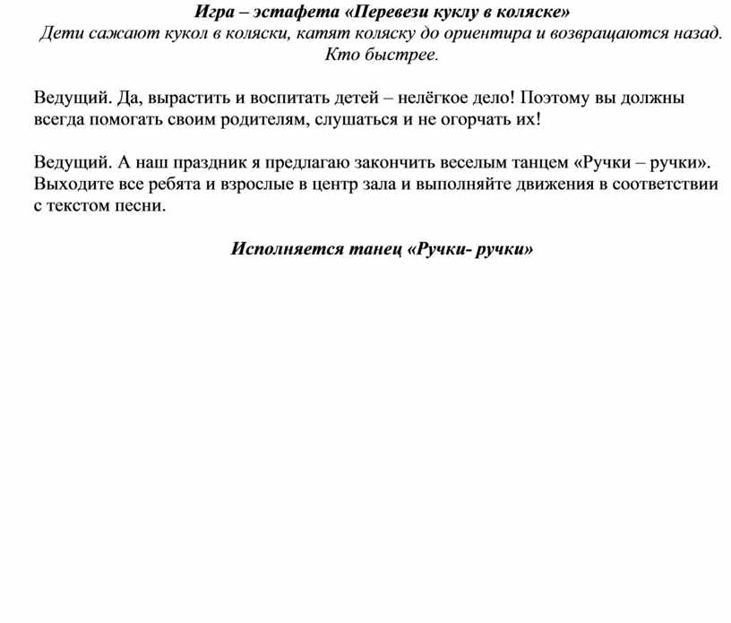 Ведущий. А наш праздник я предлагаю закончить веселым танцем «Ручки – ручки». Выходите все ребята и взрослые в центр зала и выполняйте движения в соответствии с текстом песни.