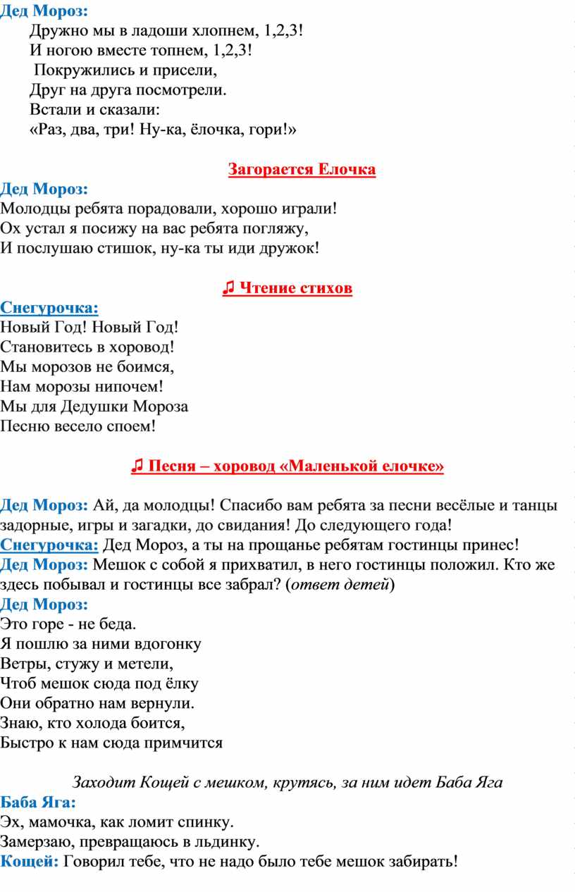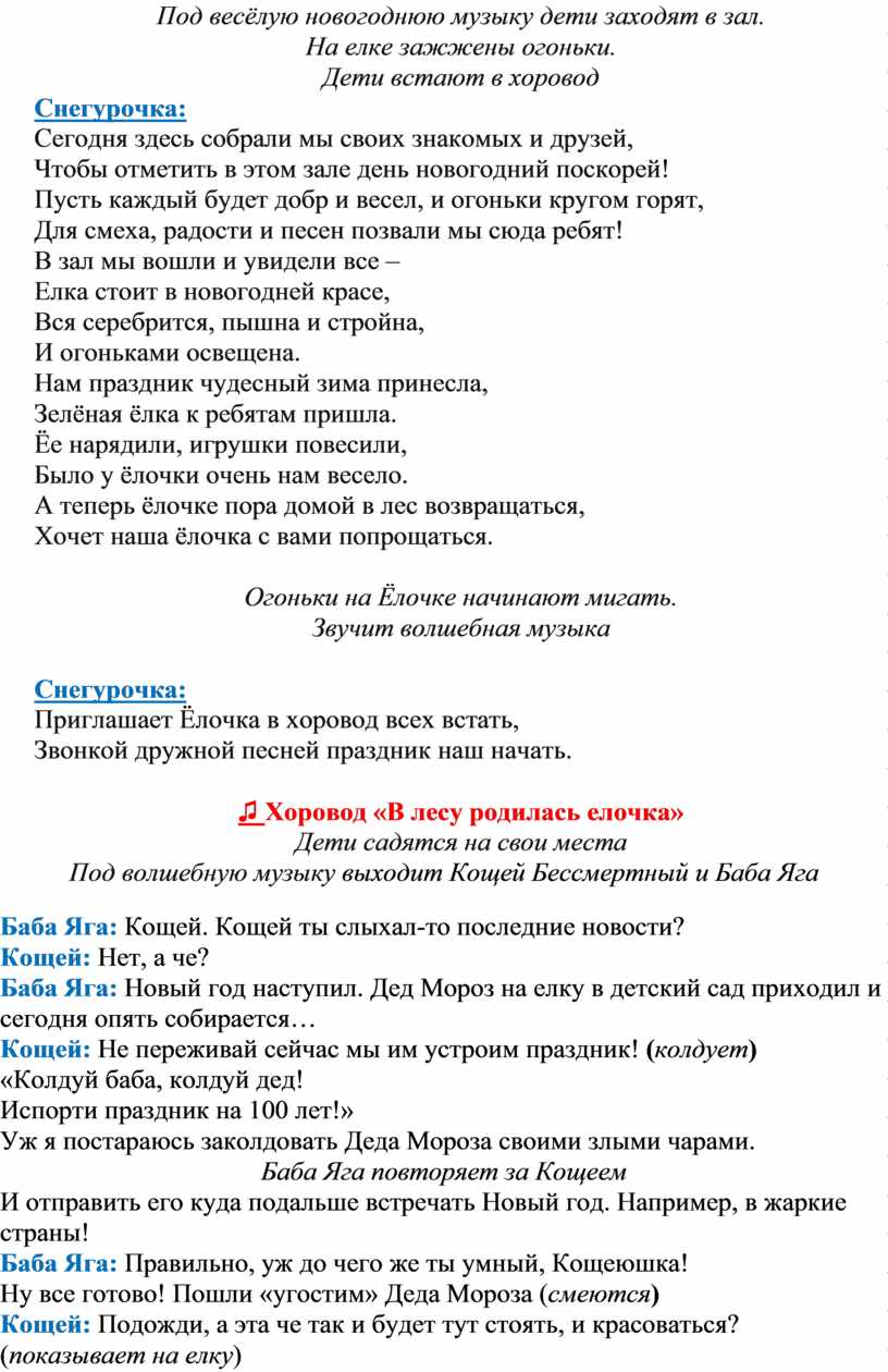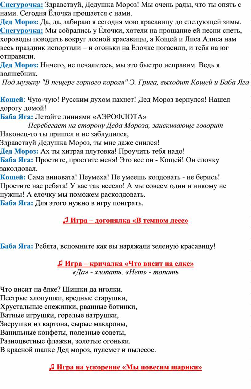 Снегурочка: Здравствуй, Дедушка Мороз! Мы очень рады, что ты опять с нами. Сегодня Ёлочка прощается с нами.