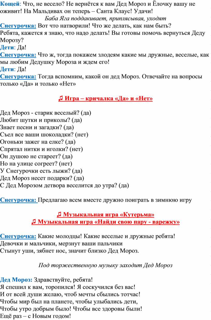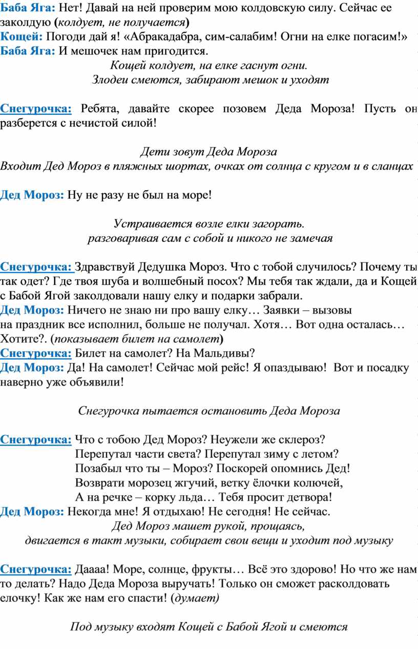 Снегурочка: Здравствуй Дедушка Мороз. Что с тобой случилось? Почему ты так одет? Где твоя шуба и волшебный посох? Мы тебя так ждали, да и Кощей с Бабой Ягой заколдовали нашу елку и подарки забрали.