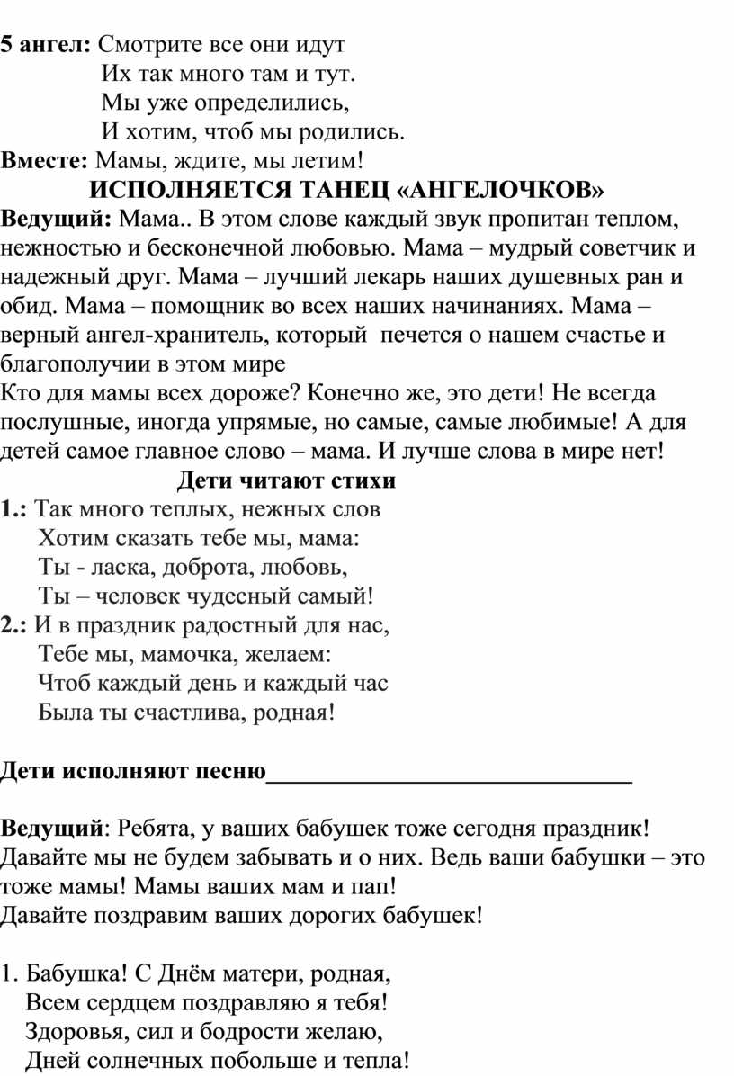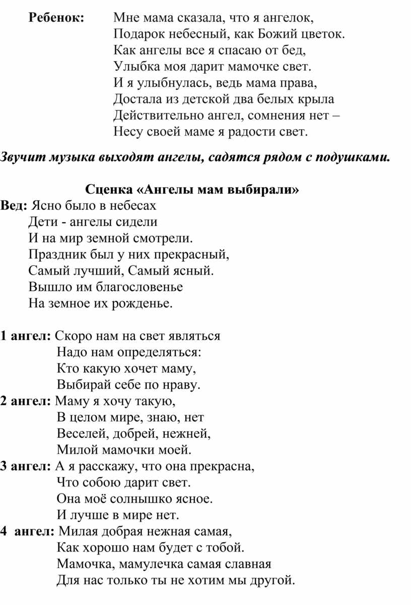 Ребенок: Мне мама сказала, что я ангелок, Подарок небесный, как Божий цветок. Как ангелы все я спасаю от бед, Улыбка моя дарит мамочке свет. И я улыбнулась, ведь мама права, Достала из детской два белых крыла Действительно ангел, сомнения нет – Несу своей маме я радости свет.