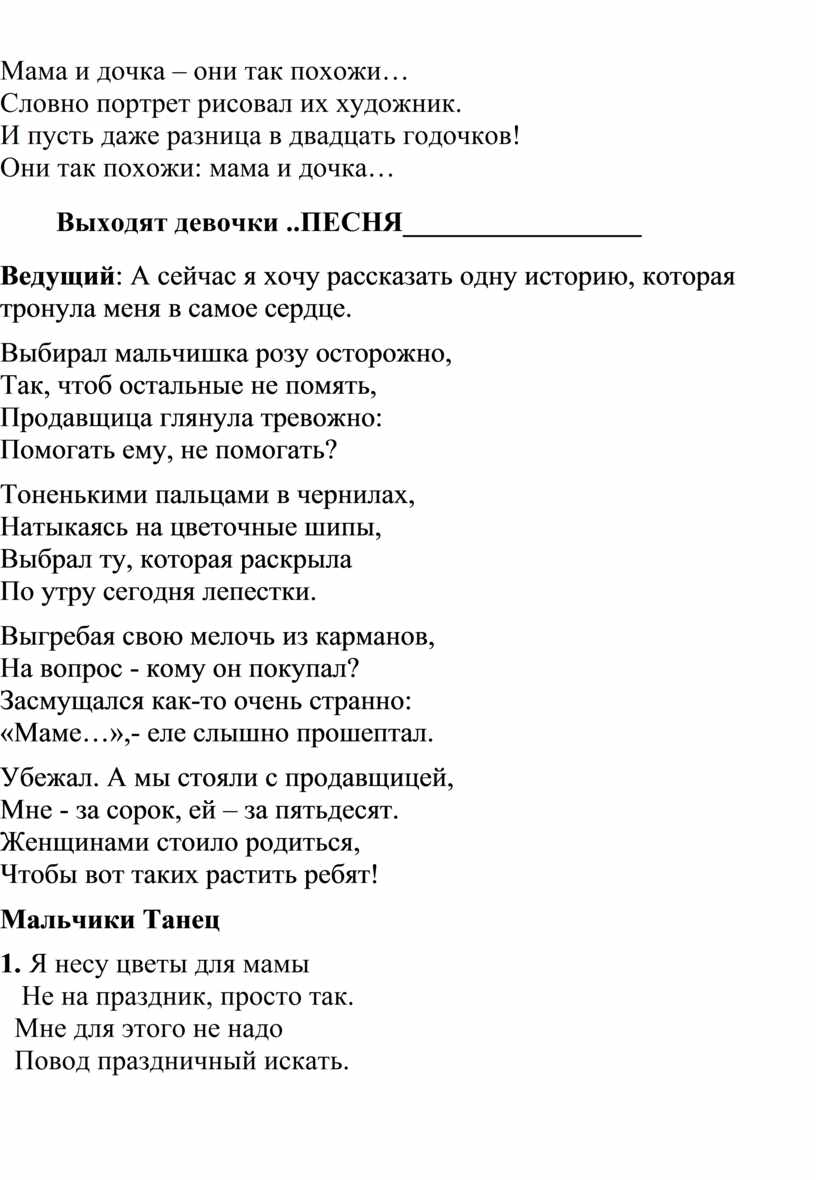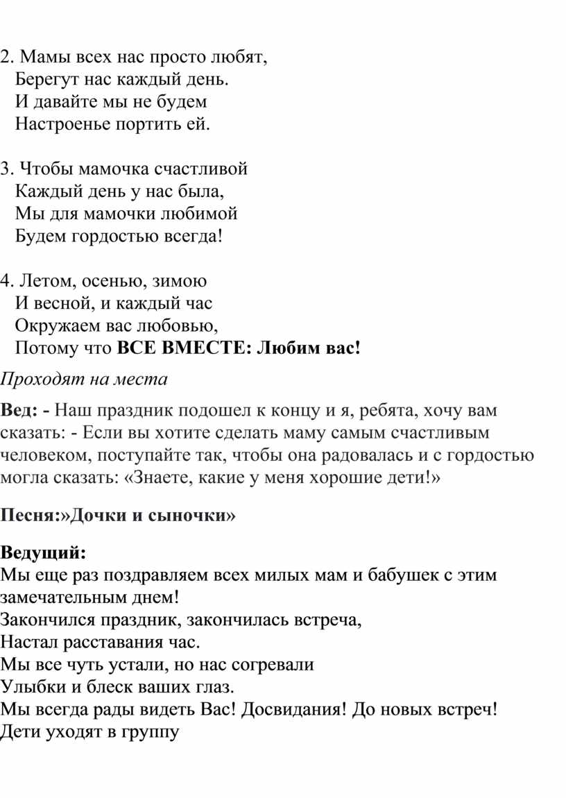Вед: - Наш праздник подошел к концу и я, ребята, хочу вам сказать: - Если вы хотите сделать маму самым счастливым человеком, поступайте так, чтобы она радовалась и с гордостью могла сказать: «Знаете, какие у меня хорошие дети!»