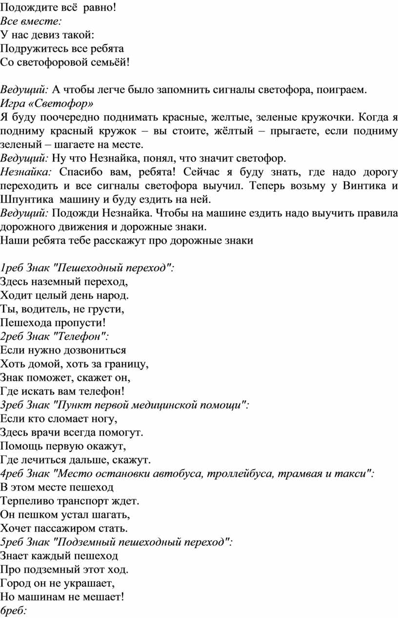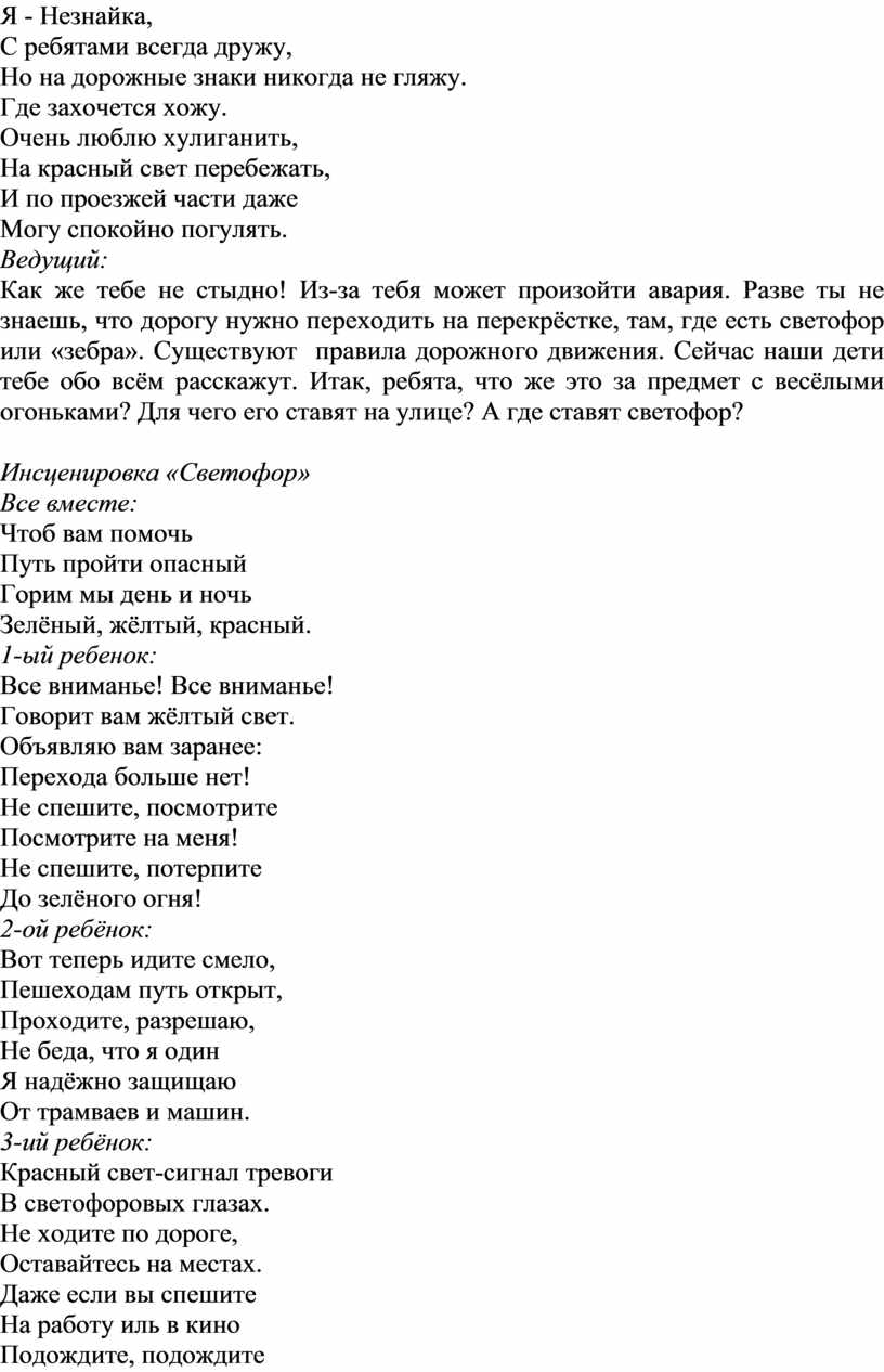 Незнайка: Спасибо вам, ребята! Сейчас я буду знать, где надо дорогу переходить и все сигналы светофора выучил. Теперь возьму у Винтика и Шпунтика машину и буду ездить на ней.