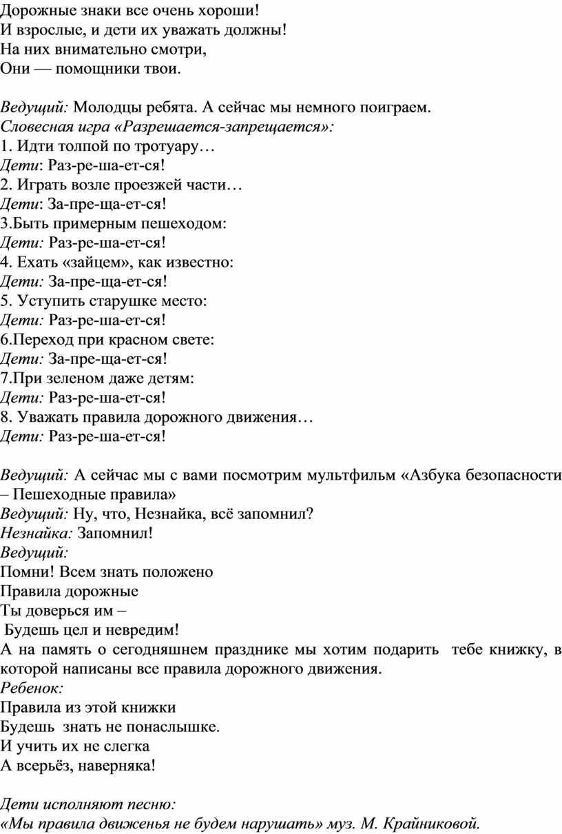 «Мы правила движенья не будем нарушать» муз. М. Крайниковой.