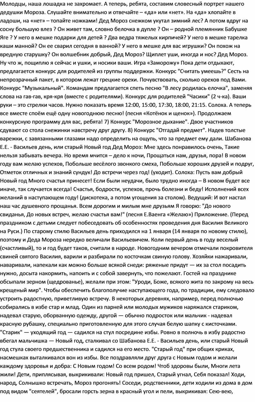 ВАСИЛЬЕВ ДЕНЬ, ИЛИ СТАРЫЙ НОВЫЙ ГОД Сценарий занятия по внеурочной деятельности для 1-2 класса. Подготовила: учитель начальных классов Шабанова Елена Евгеньевна. Цель: изучение русской народной традиции празднования Васильева дня. Задачи: воспитывать уважение к традициям русского народа; познакомиться с традиционными рождественскими и новогодними литературными и музыкальными произведениями; способствовать сплочению классного коллектива детей и родителей. Формы организации деятельности детей: познавательно- игровая программа. Оборудование: костюмы ряженых, ведьмы, Деда Мороза, Солохи; рождественская звезда (из картона или пластика), маски козы и медведя, помело для Ведьмы, 2 обрезанных пластиковых бутылки для жетонов - очков за соревнования, 2 стула, 4 стакана пластиковых, 2 одноразовые ложки, ручки и карандаши - несколько штук, фасоль – по количеству детей, 2 кастрюльки, 2 ведёрка, 2 шапки ( колпака) Деда Мороза, 2 валенка, веник с бантом, верёвка (2 м), листы газеты, 2 снежинки из салфеток и стол, 2 непрозрачных пакета с грецкими орехами, толстые варежки и платок на глаза, предметы для угадывания (ложка, вилка, ключ на брелоке, карандаш, маркер), конфеты на призы, 2 подковы из картона, разрезанные на 7 частей. Музыкальное сопровождение: Фонограммы песен: «Кабы не было зимы» из м/ф «Зима в Простоквашино», «Три белых коня», «Желаю» Е.Ваенга. Минусовки песен: «Коляда» в записи группы “Ивана Купала”, «Российский Дед Мороз», «В лесу родилась ёлочка», «Котёнок и щенок», зимняя мелодия для танца снежинок, быстрая - для конкурса. Действующие лица: Солоха( ведущая), Ведьма( Баба Яга), Дед Мороз – учитель, родители, 2 команды детей и группа поддержки родителей. Ход праздника: (звучит песня «Три белых коня») Ведущий: Здравствуйте, дорогие ребята и наши гости! Зима – самое богатое праздниками время года: Новый год, Рождество, Крещение, Масленица… Один из них – новогодние святки: Васильев день или, как называют в народе, Старый новый год. Вот и мы сегодня вместе с вами попробуем представить, как праздновали на Руси Васильев день или Старый Новый год. (Под фонограмму песни «Кабы не было зимы» девочки исполняют танец снежинок) Шабанова Е.Е. - Васильев день, или старый Новый год Солоха: Праздник начинается! Гости мои дорогие, Пожилые и молодые! Собрались мы с вами для беседушки, Собрались мы с вами для забавушки. 1-й ребенок. Как когда-то наши прадедушки, Ну а с ними и прабабушки 2-й ребенок. Приходили на веселые святки, На песни всем миром да загадки. 3-й ребенок. А что такое святки? 4-й ребенок. Праздник этот самый длинный. Он веселый и старинный. Наши предки пили, ели, Веселились две недели. 5-й ребенок. От Рождества и до Крещения, Приготовив угощенье, Пели разные колядки, По дворам ходили в Святки. 6-й ребенок. Наряжались и шутили, Праздник ждали и любили. Так давайте же сейчас Встретим мы его у нас. Входят колядовщики с куклой Колядой и рождественской звездой под песню “Коляда”. Ряженые. 1-й ряженый. Сеем, веем, посеваем, С Рождеством вас поздравляем. Счастья будет вам горой, Урожая воз большой. 2-й ряженый. Уродись у вас овес, Чтобы на два метра рос. Уродись у вас пшеничка, И горох, и чечевичка. 3-й ряженый. Шабанова Е.Е. - Васильев день, или старый Новый год Чтоб гостей невпроворот Было в доме целый год! На столе всегда пирог. Легких-легких вам дорог! 4-й ряженый. С колядою поздравляем 