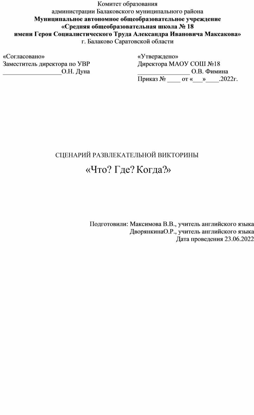 «Утверждено» Директора МАОУ СОШ №18 ________________ О.В. Фимина Приказ № ____ от «___»____.2022г. |