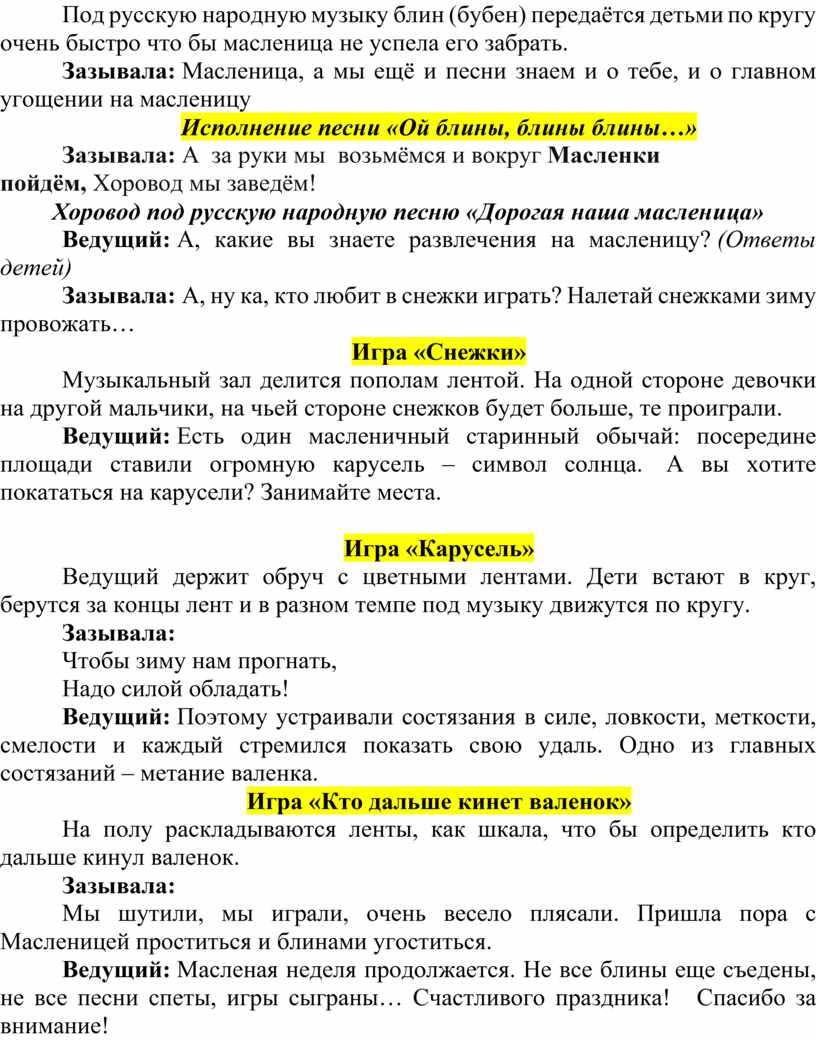 Ведущий: Масленая неделя продолжается. Не все блины еще съедены, не все песни спеты, игры сыграны… Счастливого праздника! Спасибо за внимание!