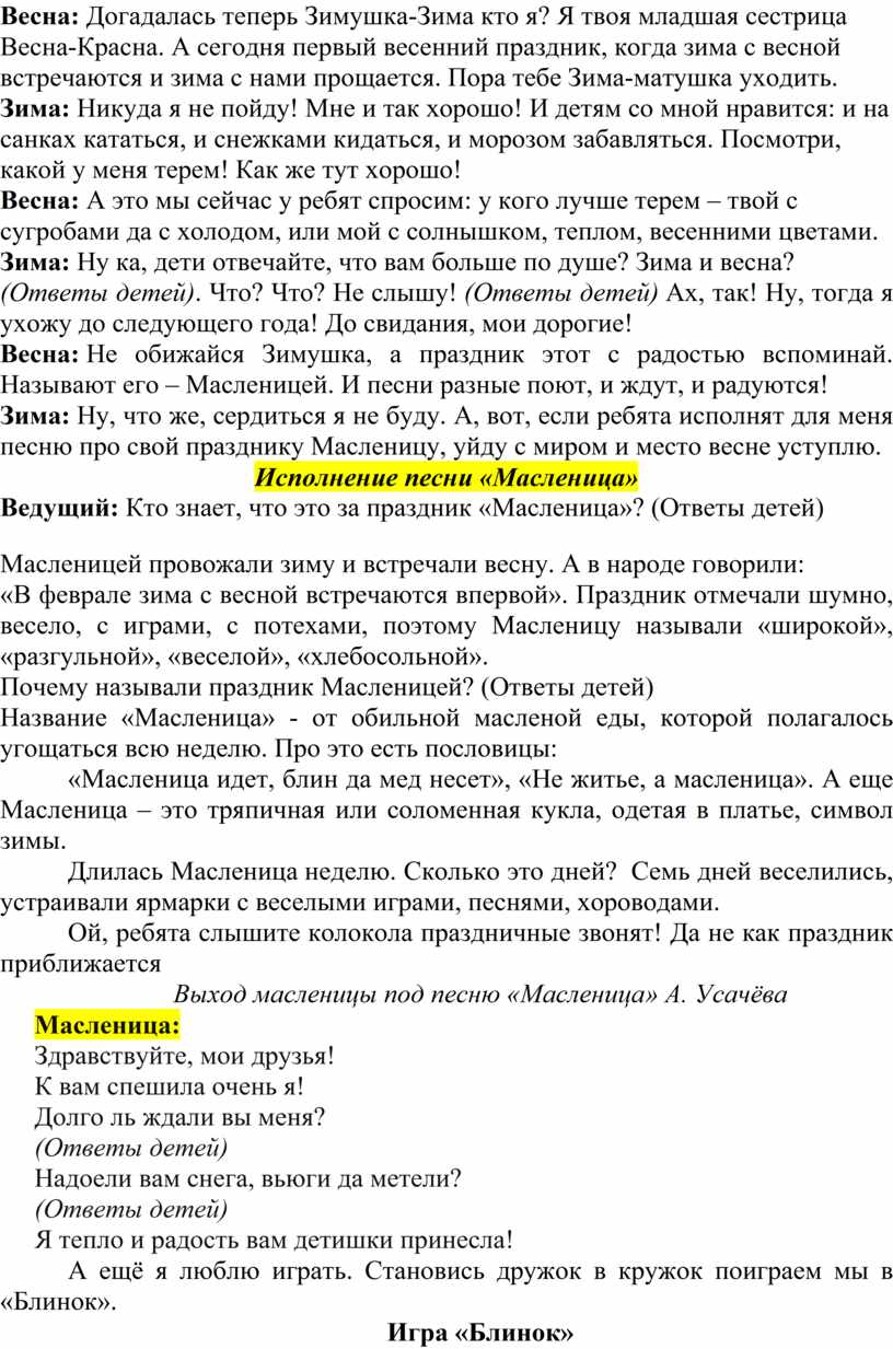 Весна: Догадалась теперь Зимушка-Зима кто я? Я твоя младшая сестрица Весна-Красна. А сегодня первый весенний праздник, когда зима с весной встречаются и зима с нами прощается. Пора тебе Зима-матушка уходить.