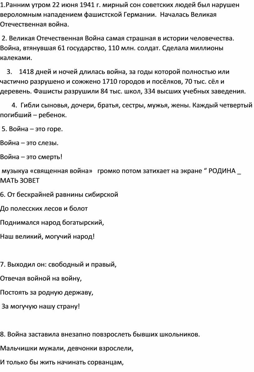 1.Ранним утром 22 июня 1941 г. мирный сон советских людей был нарушен вероломным нападением фашистской Германии. Началась Великая Отечественная война.