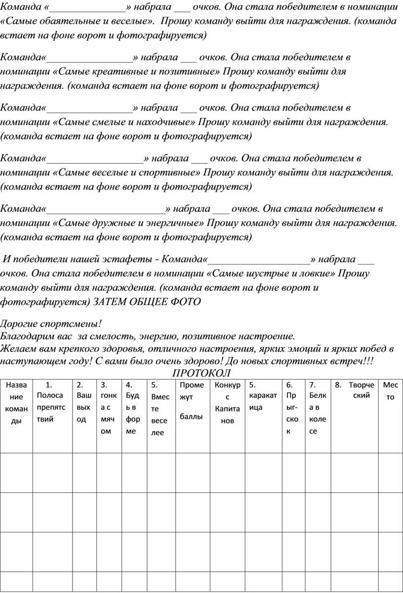 И победители нашей эстафеты - Команда«___________________» набрала ___ очков. Она стала победителем в номинации «Самые шустрые и ловкие» Прошу команду выйти для награждения. (команда встает на фоне ворот и фотографируется) ЗАТЕМ ОБЩЕЕ ФОТО