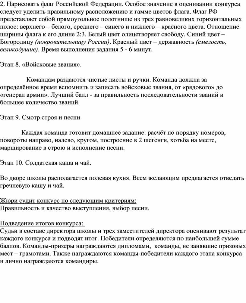 Каждая команда готовит домашнее задание: расчёт по порядку номеров, повороты направо, налево, кругом, построение в 2 шегенги, хотьба на месте, марширование в строю и исполнение песни.