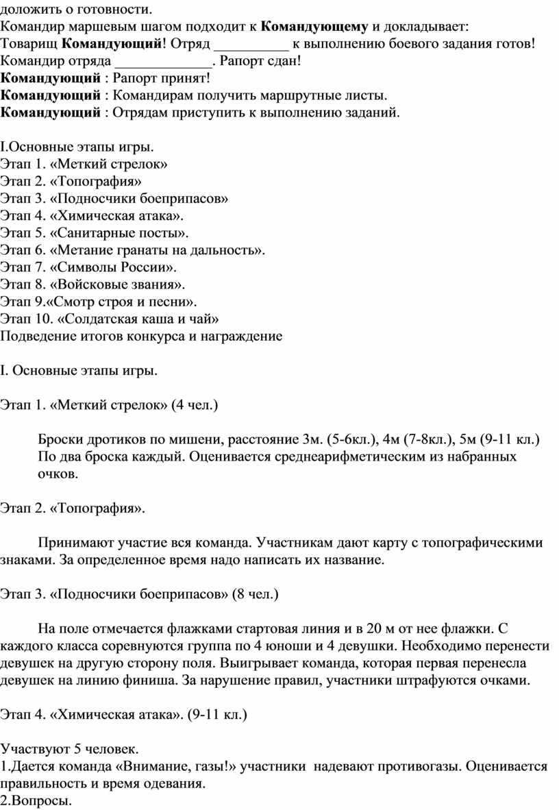 Товарищ Командующий! Отряд __________ к выполнению боевого задания готов! Командир отряда _____________. Рапорт сдан!