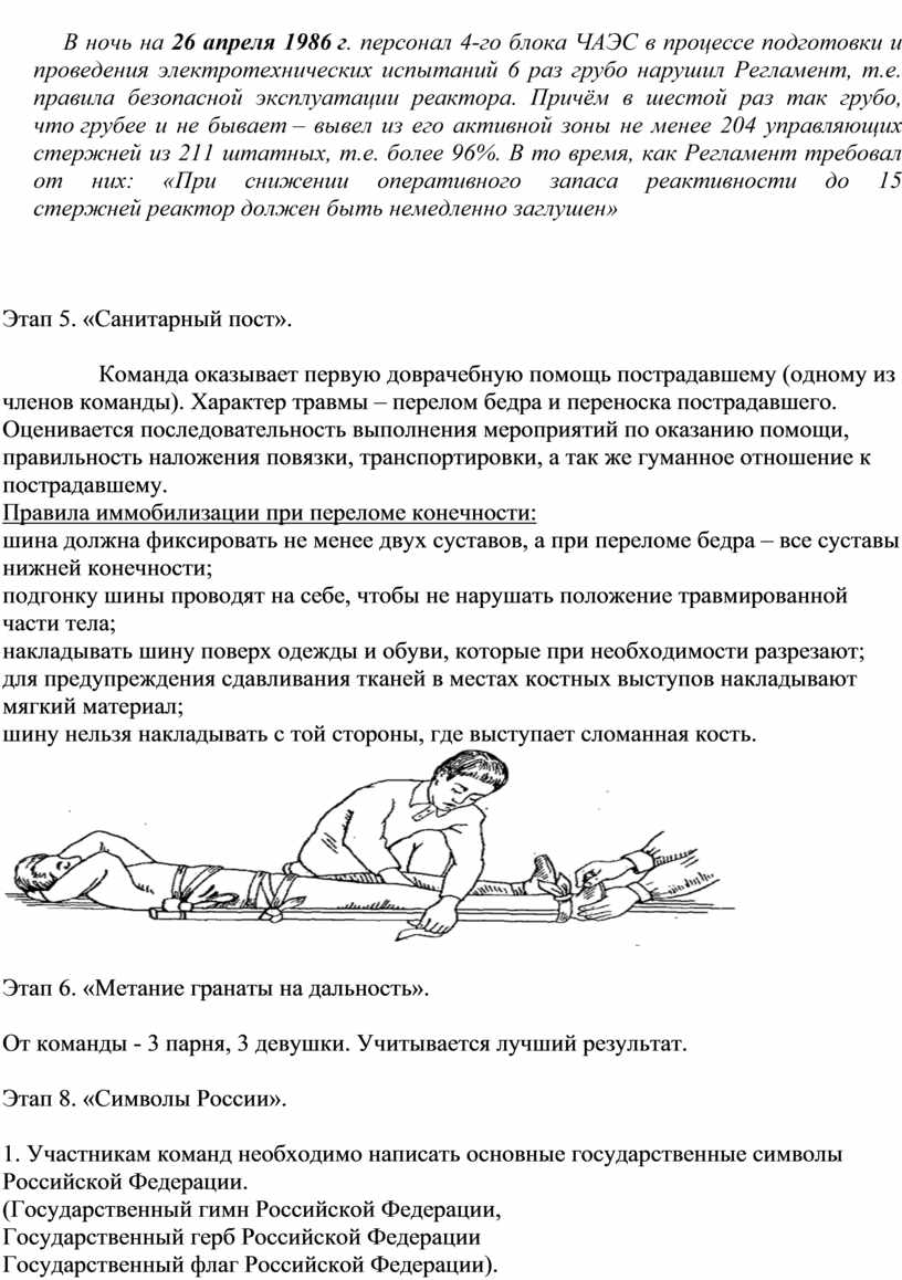 Команда оказывает первую доврачебную помощь пострадавшему (одному из членов команды). Характер травмы – перелом бедра и переноска пострадавшего. Оценивается последовательность выполнения мероприятий по оказанию помощи, правильность наложения повязки, транспортировки, а так же гуманное отношение к пострадавшему.