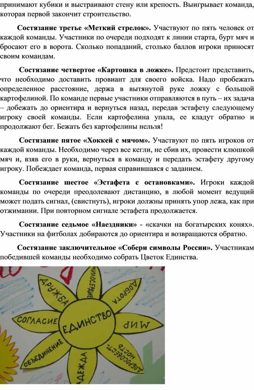 Состязание заключительное «Собери символы России». Участникам победившей команды необходимо собрать Цветок Единства.