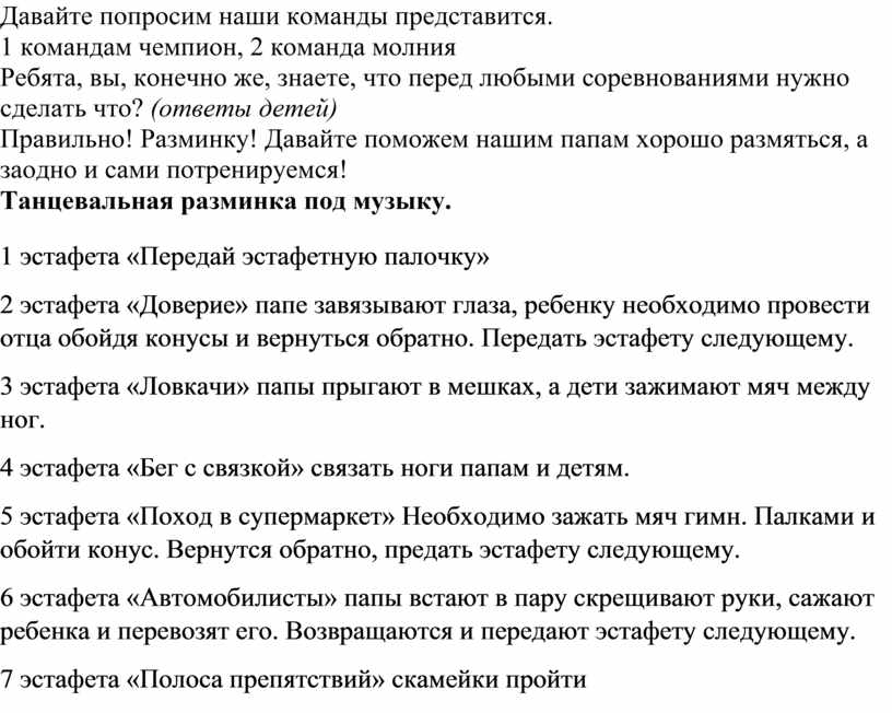 6 эстафета «Автомобилисты» папы встают в пару скрещивают руки, сажают ребенка и перевозят его. Возвращаются и передают эстафету следующему.