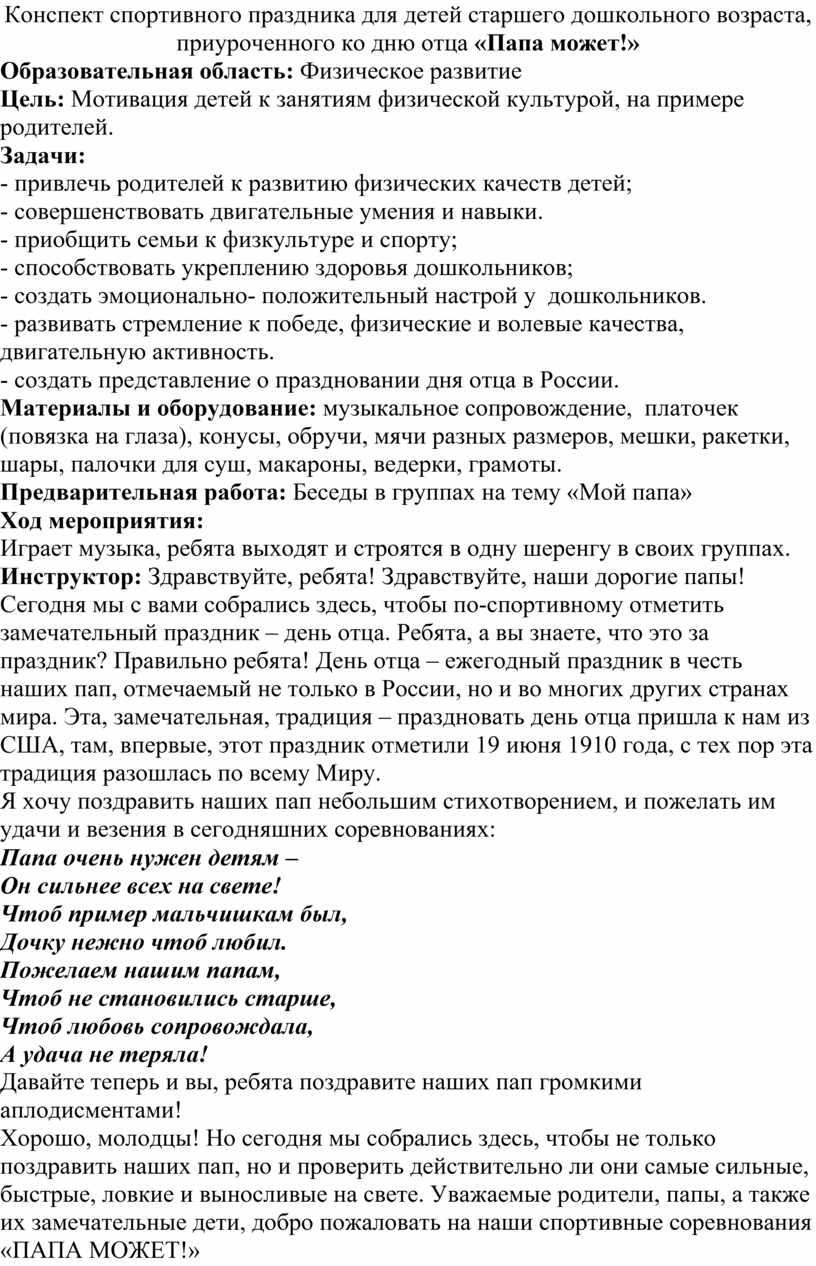 Конспект спортивного праздника для детей старшего дошкольного возраста, приуроченного ко дню отца «Папа может!»