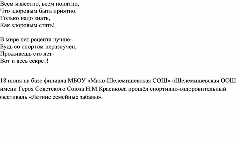 18 июня на базе филиала МБОУ «Мало-Шелемишевская СОШ» «Шелемишевская ООШ имени Героя Советского Союза Н.М.Красикова прошёл спортивно-оздоровительный фестиваль «Летние семейные забавы».