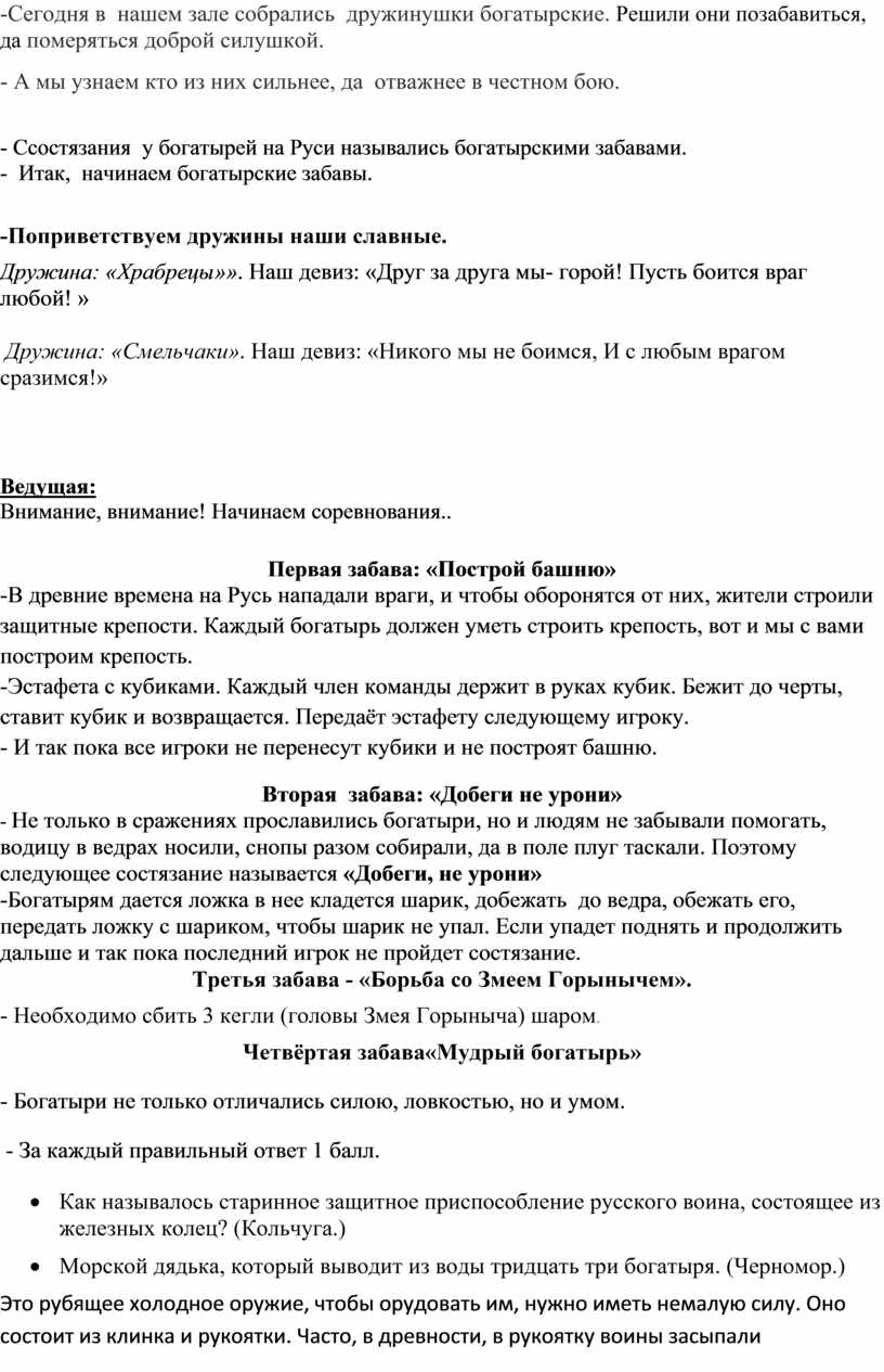-Сегодня в нашем зале собрались дружинушки богатырские. Решили они позабавиться, да померяться доброй силушкой.
