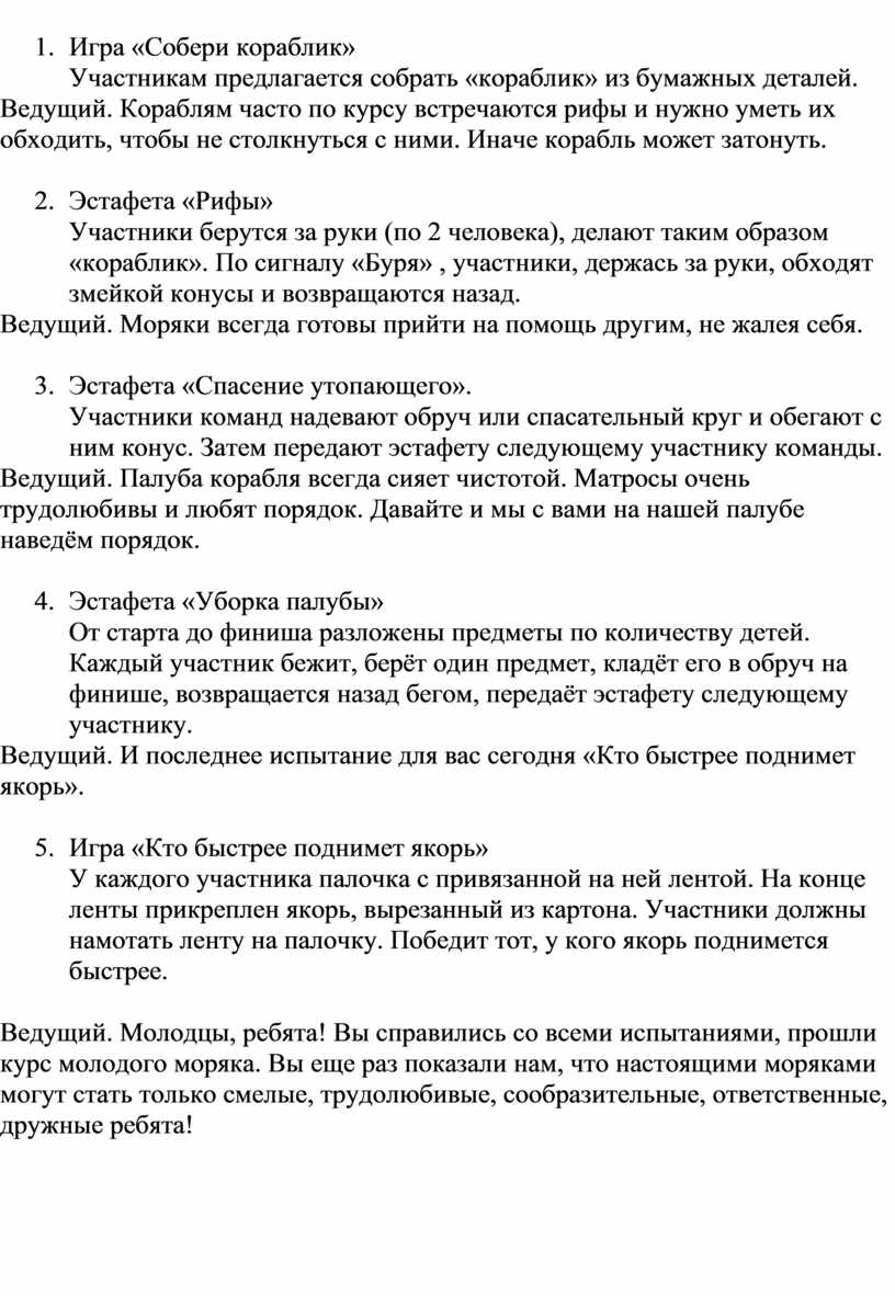 Ведущий. Здравствуйте, ребята! Сегодня я предлагаю вам поиграть и ненадолго стать моряками, мы с вами сможем повеселиться и выяснить, кто из нас самый смелый, быстрый и умелый. А кто же такие моряки?