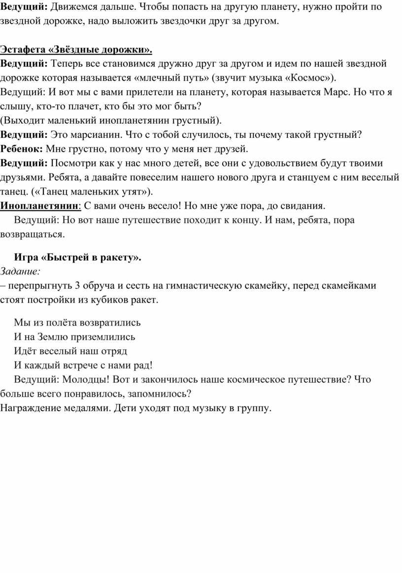 Ведущий: Молодцы! Вот и закончилось наше космическое путешествие? Что больше всего понравилось, запомнилось?