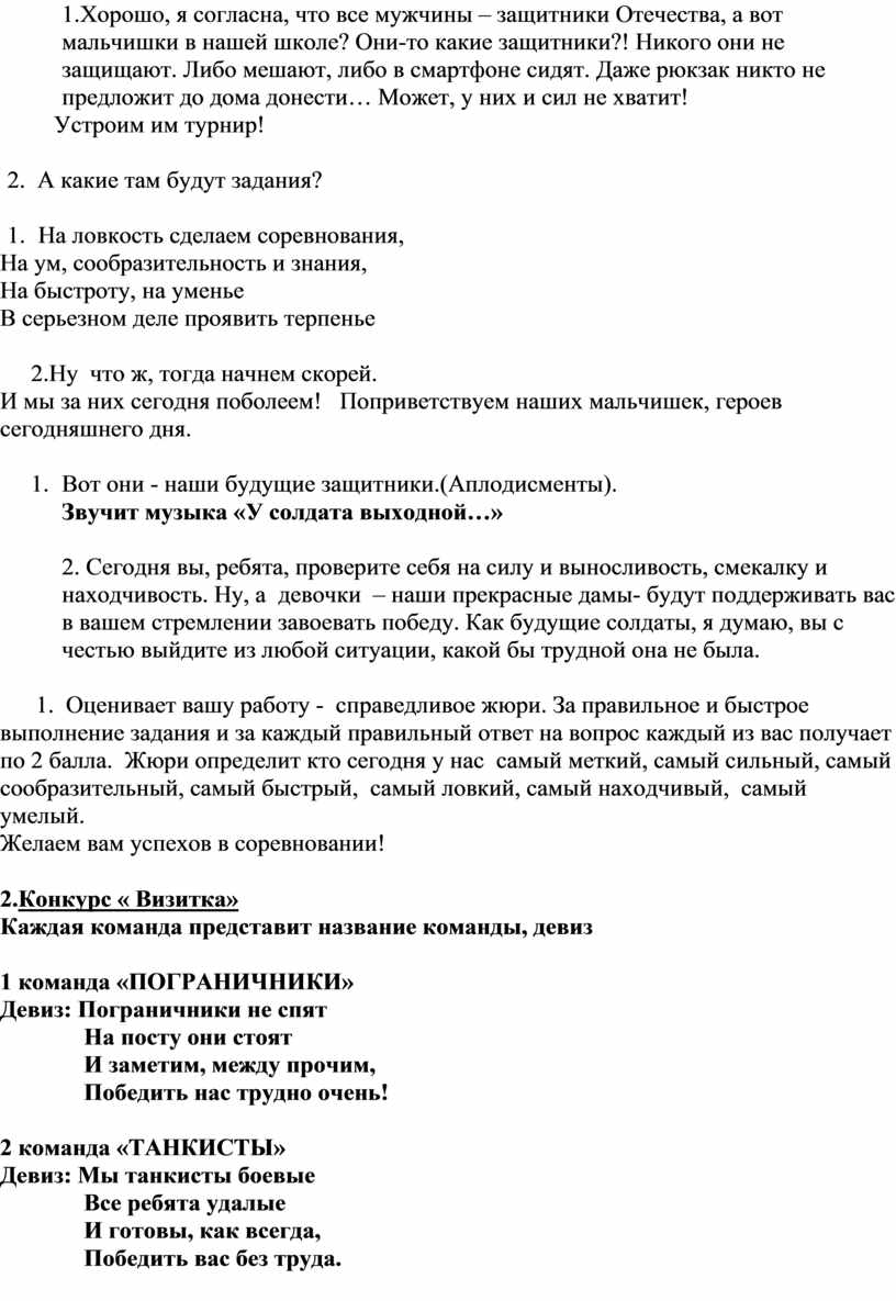 2. Сегодня вы, ребята, проверите себя на силу и выносливость, смекалку и находчивость. Ну, а девочки – наши прекрасные дамы- будут поддерживать вас в вашем стремлении завоевать победу. Как будущие солдаты, я думаю, вы с честью выйдите из любой ситуации, какой бы трудной она не была.