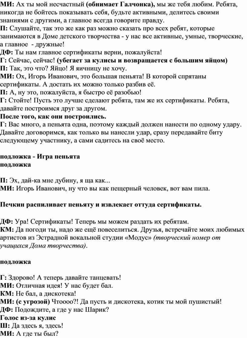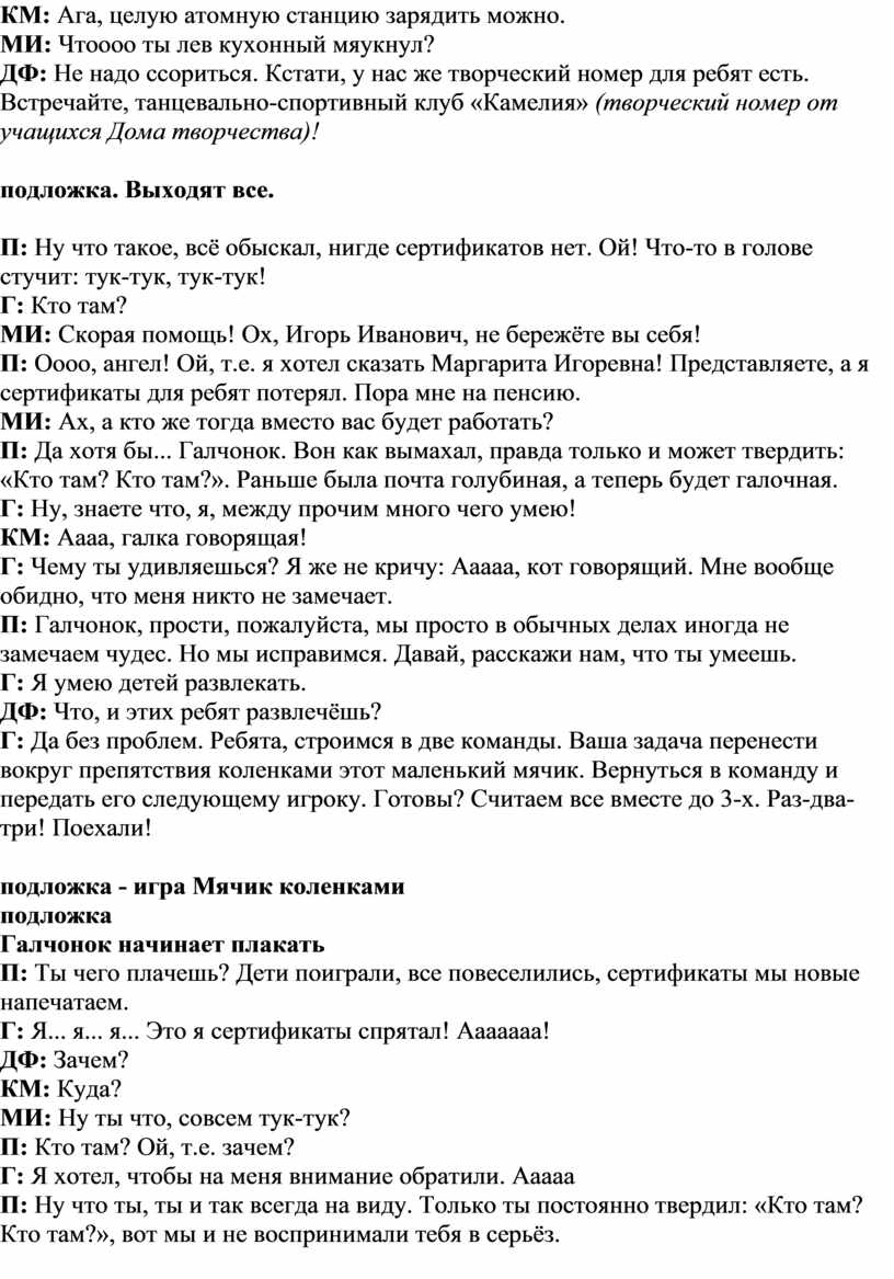 КМ: Да погоди ты, надо же ещё повеселиться. Друзья, встречайте моих любимых артистов из Эстрадной вокальной студии «Модус» (творческий номер от учащихся Дома творчества).