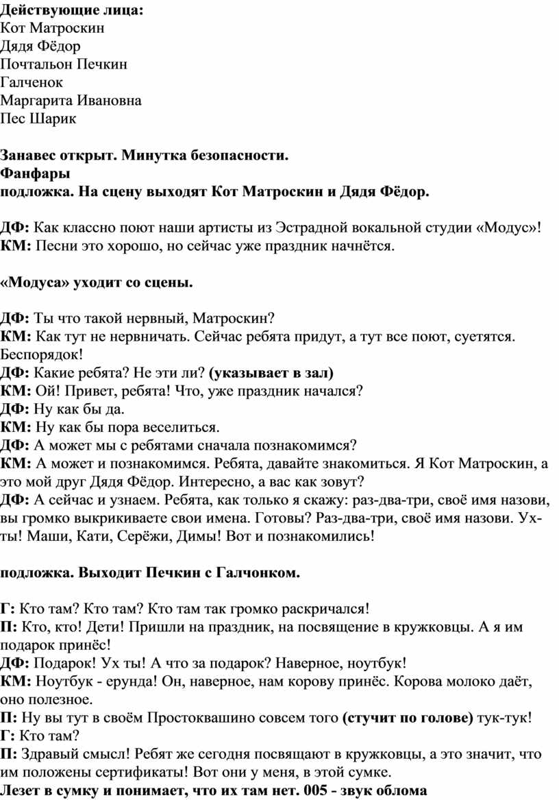 подложка. На сцену выходят Кот Матроскин и Дядя Фёдор.