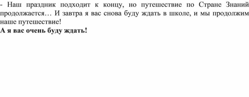 - Наш праздник подходит к концу, но путешествие по Стране Знаний продолжается… И завтра я вас снова буду ждать в школе, и мы продолжим наше путешествие!