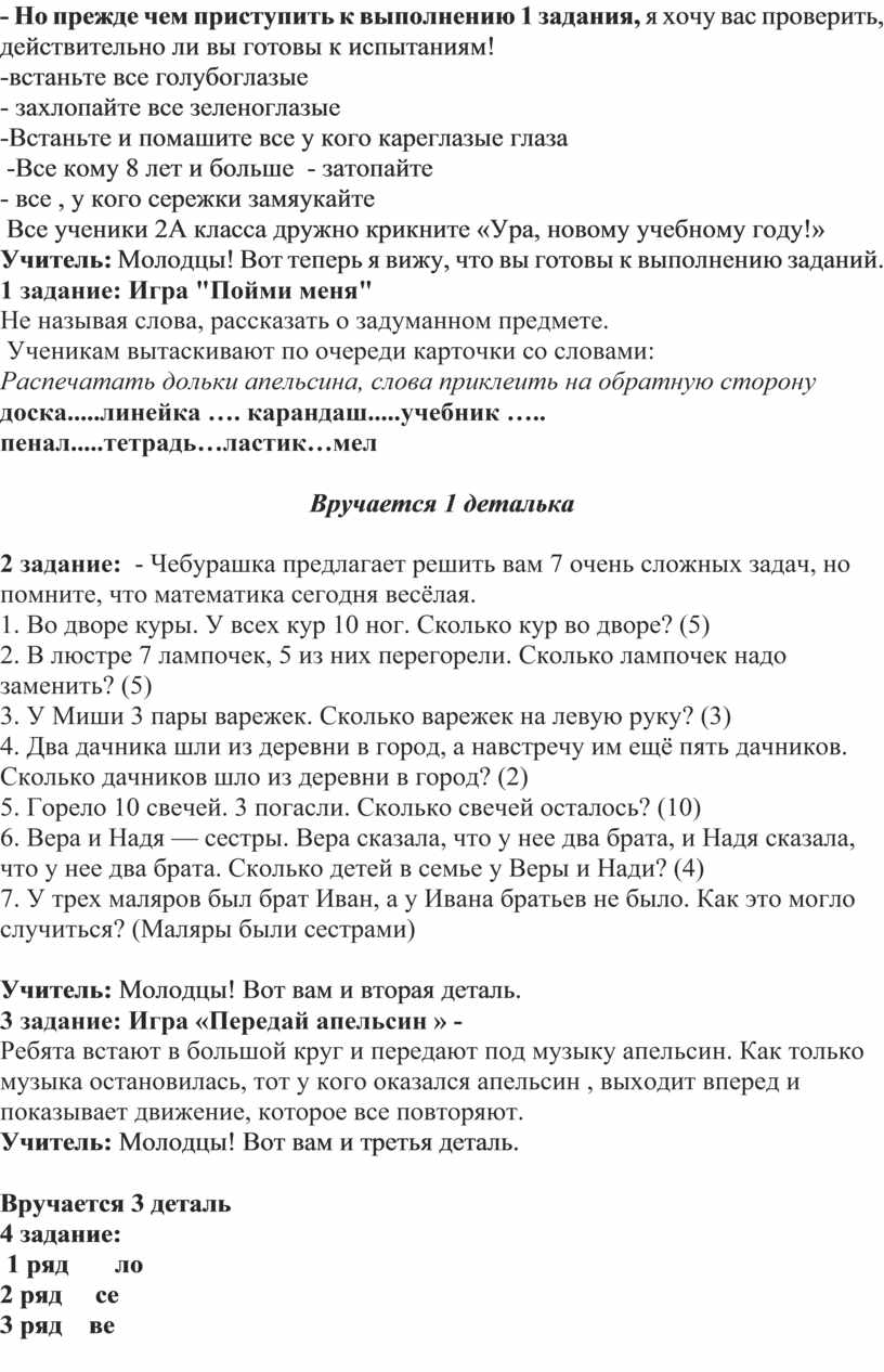 Учитель: Здравствуйте, ребята, уважаемые взрослые! Вот и закончились летние каникулы. И уже во второй раз вы пришли в школу, теперь вы – второклассники! Я надеюсь, что вы хорошо отдохнули и готовы отправиться в длинное путешествие по стране Знаний.