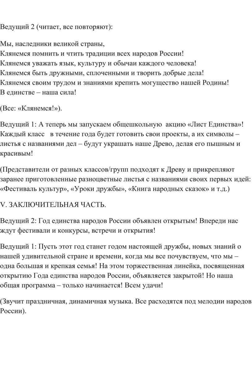 Ведущий 1: Пусть этот год станет годом настоящей дружбы, новых знаний о нашей удивительной стране и времени, когда мы все почувствуем, что мы – одна большая и крепкая семья! На этом торжественная линейка, посвященная открытию Года единства народов России, объявляется закрытой! Но наша общая программа – только начинается! Всем удачи!