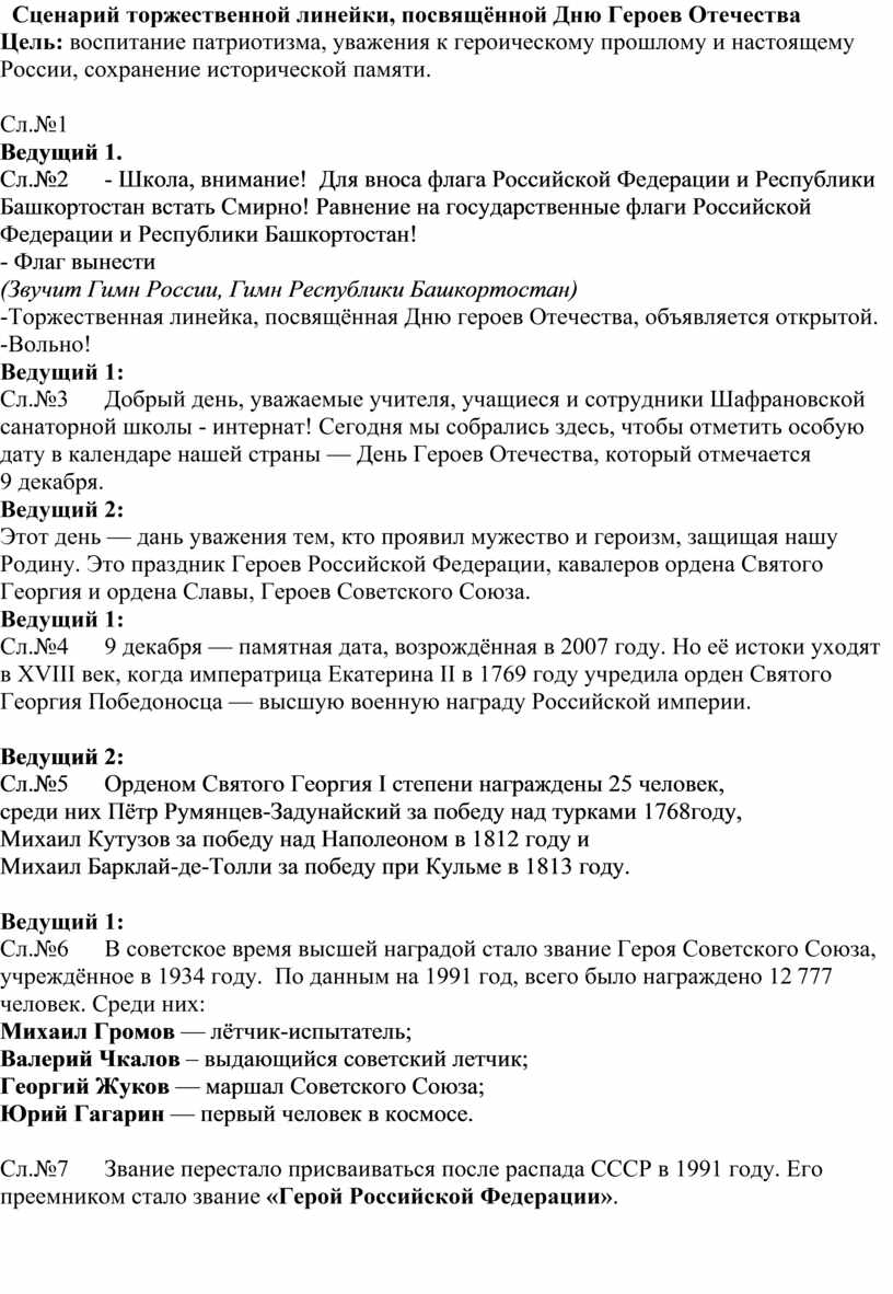 Сценарий торжественной линейки, посвящённой Дню Героев Отечества